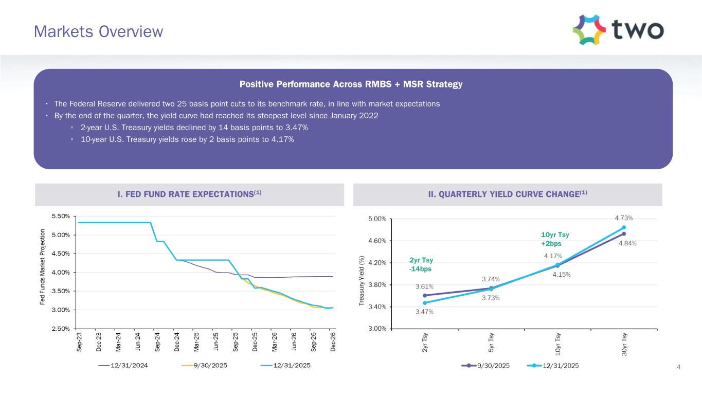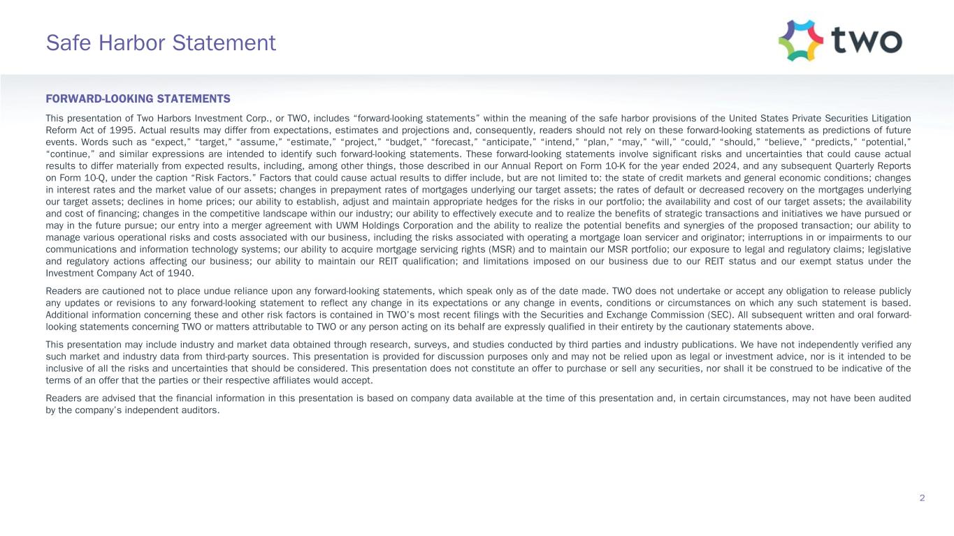 Safe Harbor Statement 2 FORWARD-LOOKING STATEMENTS This presentation of Two Harbors Investment Corp., or TWO, includes “forward-looking statements” within the meaning of the safe harbor provisions of the United States Private Securities Litigation Reform Act of 1995. Actual results may differ from expectations, estimates and projections and, consequently, readers should not rely on these forward-looking statements as predictions of future events. Words such as “expect,” “target,” “assume,” “estimate,” “project,” “budget,” “forecast,” “anticipate,” “intend,” “plan,” “may,” “will,” “could,” “should,” “believe,” “predicts,” “potential,” “continue,” and similar expressions are intended to identify such forward-looking statements. These forward-looking statements involve significant risks and uncertainties that could cause actual results to differ materially from expected results, including, among other things, those described in our Annual Report on Form 10-K for the year ended 2024, and any subsequent Quarterly Reports on Form 10-Q, under the caption “Risk Factors.” Factors that could cause actual results to differ include, but are not limited to: the state of credit markets and general economic conditions; changes in interest rates and the market value of our assets; changes in prepayment rates of mortgages underlying our target assets; the rates of default or decreased recovery on the mortgages underlying our target assets; declines in home prices; our ability to establish, adjust and maintain appropriate hedges for the risks in our portfolio; the availability and cost of our target assets; the availability and cost of financing; changes in the competitive landscape within our industry; our ability to effectively execute and to realize the benefits of strategic transactions and initiatives we have pursued or may in the future pursue; our entry into a merger agreement with UWM Holdings Corporation and the ability to realize the potential benefits and synergies of the proposed transaction; our ability to manage various operational risks and costs associated with our business, including the risks associated with operating a mortgage loan servicer and originator; interruptions in or impairments to our communications and information technology systems; our ability to acquire mortgage servicing rights (MSR) and to maintain our MSR portfolio; our exposure to legal and regulatory claims; legislative and regulatory actions affecting our business; our ability to maintain our REIT qualification; and limitations imposed on our business due to our REIT status and our exempt status under the Investment Company Act of 1940. Readers are cautioned not to place undue reliance upon any forward-looking statements, which speak only as of the date made. TWO does not undertake or accept any obligation to release publicly any updates or revisions to any forward-looking statement to reflect any change in its expectations or any change in events, conditions or circumstances on which any such statement is based. Additional information concerning these and other risk factors is contained in TWO’s most recent filings with the Securities and Exchange Commission (SEC). All subsequent written and oral forward- looking statements concerning TWO or matters attributable to TWO or any person acting on its behalf are expressly qualified in their entirety by the cautionary statements above. This presentation may include industry and market data obtained through research, surveys, and studies conducted by third parties and industry publications. We have not independently verified any such market and industry data from third-party sources. This presentation is provided for discussion purposes only and may not be relied upon as legal or investment advice, nor is it intended to be inclusive of all the risks and uncertainties that should be considered. This presentation does not constitute an offer to purchase or sell any securities, nor shall it be construed to be indicative of the terms of an offer that the parties or their respective affiliates would accept. Readers are advised that the financial information in this presentation is based on company data available at the time of this presentation and, in certain circumstances, may not have been audited by the company’s independent auditors.