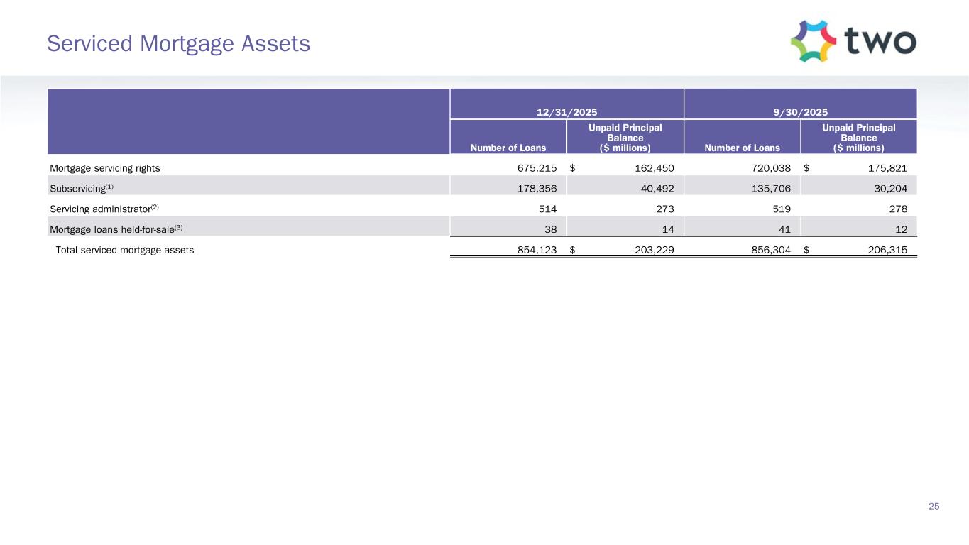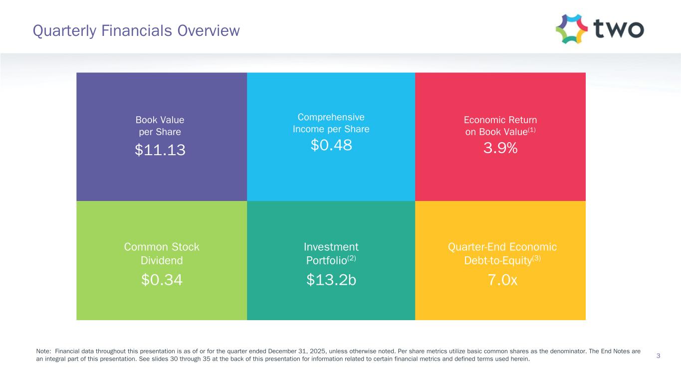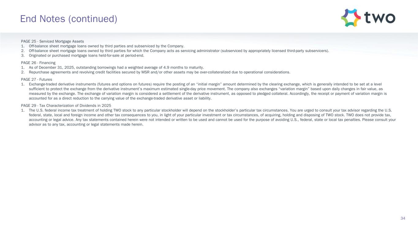 PAGE 25 - Serviced Mortgage Assets 1. Off-balance sheet mortgage loans owned by third parties and subserviced by the Company. 2. Off-balance sheet mortgage loans owned by third parties for which the Company acts as servicing administrator (subserviced by appropriately licensed third-party subservicers). 3. Originated or purchased mortgage loans held-for-sale at period-end. PAGE 26 - Financing 1. As of December 31, 2025, outstanding borrowings had a weighted average of 4.9 months to maturity. 2. Repurchase agreements and revolving credit facilities secured by MSR and/or other assets may be over-collateralized due to operational considerations. PAGE 27 - Futures 1. Exchange-traded derivative instruments (futures and options on futures) require the posting of an “initial margin” amount determined by the clearing exchange, which is generally intended to be set at a level sufficient to protect the exchange from the derivative instrument’s maximum estimated single-day price movement. The company also exchanges “variation margin” based upon daily changes in fair value, as measured by the exchange. The exchange of variation margin is considered a settlement of the derivative instrument, as opposed to pledged collateral. Accordingly, the receipt or payment of variation margin is accounted for as a direct reduction to the carrying value of the exchange-traded derivative asset or liability. PAGE 29 - Tax Characterization of Dividends in 2025 1. The U.S. federal income tax treatment of holding TWO stock to any particular stockholder will depend on the stockholder’s particular tax circumstances. You are urged to consult your tax advisor regarding the U.S. federal, state, local and foreign income and other tax consequences to you, in light of your particular investment or tax circumstances, of acquiring, holding and disposing of TWO stock. TWO does not provide tax, accounting or legal advice. Any tax statements contained herein were not intended or written to be used and cannot be used for the purpose of avoiding U.S., federal, state or local tax penalties. Please consult your advisor as to any tax, accounting or legal statements made herein. 34 End Notes (continued)