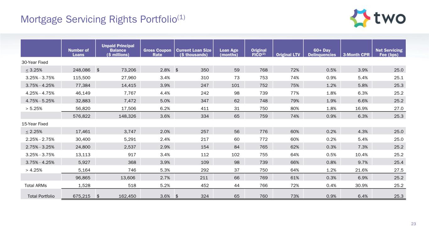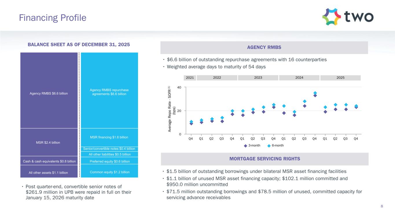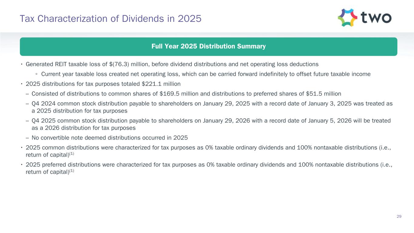 PAGE 25 - Serviced Mortgage Assets 1. Off-balance sheet mortgage loans owned by third parties and subserviced by the Company. 2. Off-balance sheet mortgage loans owned by third parties for which the Company acts as servicing administrator (subserviced by appropriately licensed third-party subservicers). 3. Originated or purchased mortgage loans held-for-sale at period-end. PAGE 26 - Financing 1. As of December 31, 2025, outstanding borrowings had a weighted average of 4.9 months to maturity. 2. Repurchase agreements and revolving credit facilities secured by MSR and/or other assets may be over-collateralized due to operational considerations. PAGE 27 - Futures 1. Exchange-traded derivative instruments (futures and options on futures) require the posting of an “initial margin” amount determined by the clearing exchange, which is generally intended to be set at a level sufficient to protect the exchange from the derivative instrument’s maximum estimated single-day price movement. The company also exchanges “variation margin” based upon daily changes in fair value, as measured by the exchange. The exchange of variation margin is considered a settlement of the derivative instrument, as opposed to pledged collateral. Accordingly, the receipt or payment of variation margin is accounted for as a direct reduction to the carrying value of the exchange-traded derivative asset or liability. PAGE 29 - Tax Characterization of Dividends in 2025 1. The U.S. federal income tax treatment of holding TWO stock to any particular stockholder will depend on the stockholder’s particular tax circumstances. You are urged to consult your tax advisor regarding the U.S. federal, state, local and foreign income and other tax consequences to you, in light of your particular investment or tax circumstances, of acquiring, holding and disposing of TWO stock. TWO does not provide tax, accounting or legal advice. Any tax statements contained herein were not intended or written to be used and cannot be used for the purpose of avoiding U.S., federal, state or local tax penalties. Please consult your advisor as to any tax, accounting or legal statements made herein. 34 End Notes (continued)