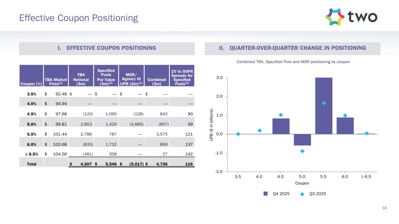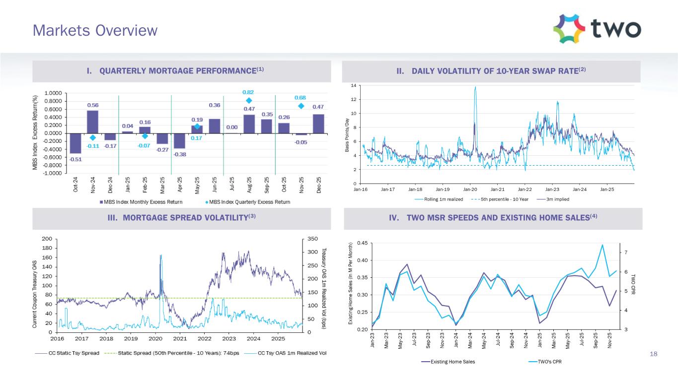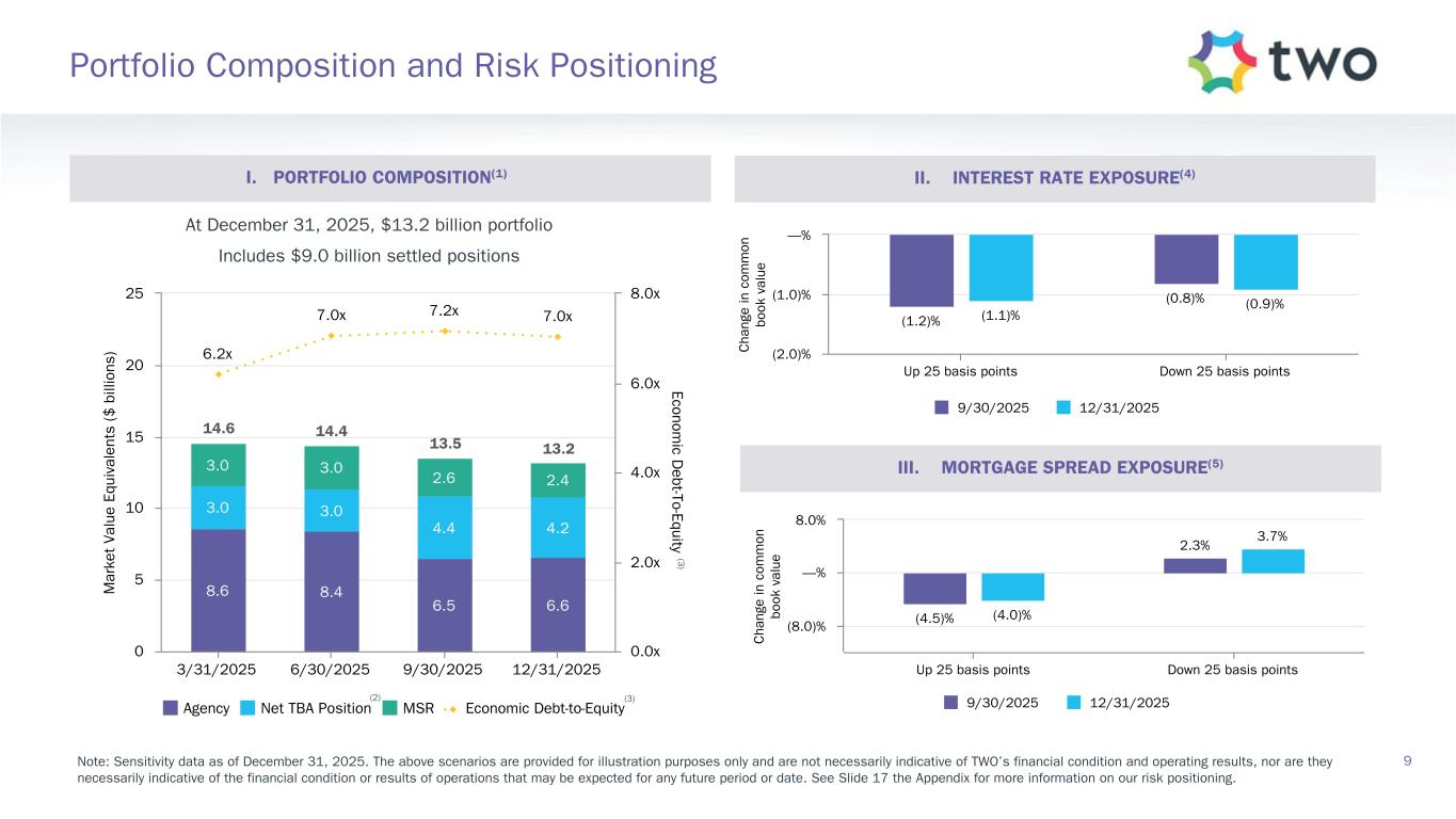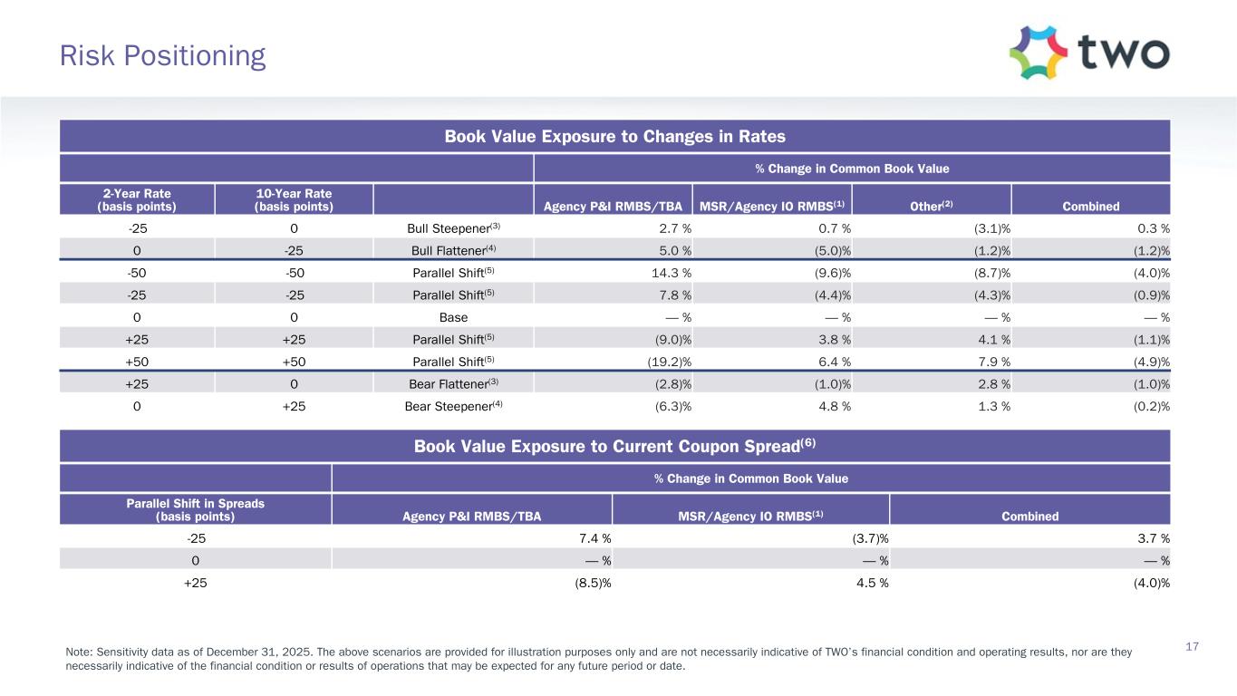 Note: Sensitivity data as of December 31, 2025. The above scenarios are provided for illustration purposes only and are not necessarily indicative of TWO’s financial condition and operating results, nor are they necessarily indicative of the financial condition or results of operations that may be expected for any future period or date. Book Value Exposure to Changes in Rates % Change in Common Book Value 2-Year Rate (basis points) 10-Year Rate (basis points) Agency P&I RMBS/TBA MSR/Agency IO RMBS(1) Other(2) Combined -25 0 Bull Steepener(3) 2.7 % 0.7 % (3.1) % 0.3 % 0 -25 Bull Flattener(4) 5.0 % (5.0) % (1.2) % (1.2) % -50 -50 Parallel Shift(5) 14.3 % (9.6) % (8.7) % (4.0) % -25 -25 Parallel Shift(5) 7.8 % (4.4) % (4.3) % (0.9) % 0 0 Base — % — % — % — % +25 +25 Parallel Shift(5) (9.0) % 3.8 % 4.1 % (1.1) % +50 +50 Parallel Shift(5) (19.2) % 6.4 % 7.9 % (4.9) % +25 0 Bear Flattener(3) (2.8) % (1.0) % 2.8 % (1.0) % 0 +25 Bear Steepener(4) (6.3) % 4.8 % 1.3 % (0.2) % Book Value Exposure to Current Coupon Spread(6) % Change in Common Book Value Parallel Shift in Spreads (basis points) Agency P&I RMBS/TBA MSR/Agency IO RMBS(1) Combined -25 7.4 % (3.7) % 3.7 % 0 — % — % — % +25 (8.5) % 4.5 % (4.0) % 17 Risk Positioning