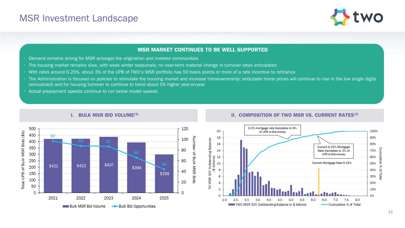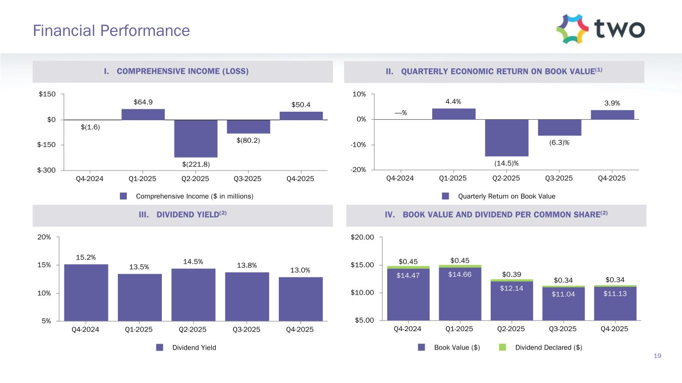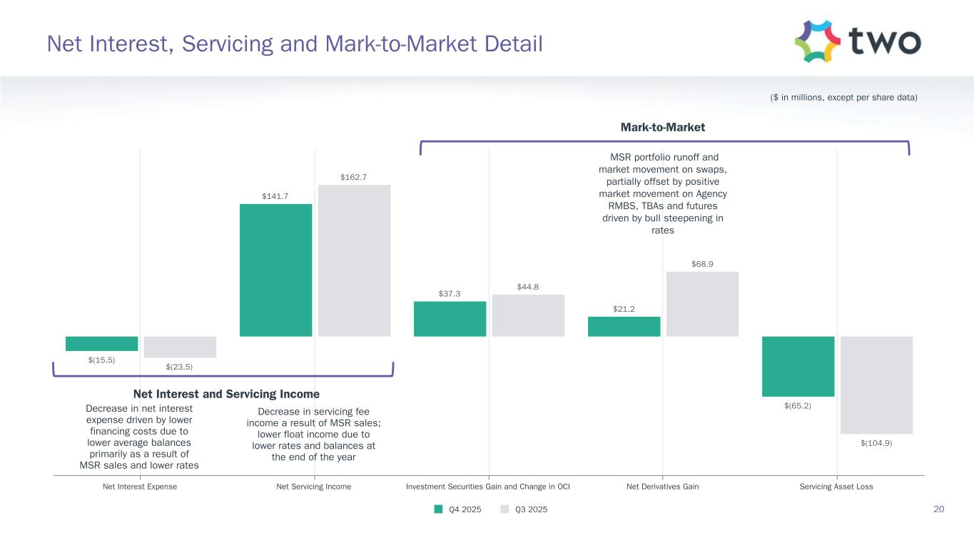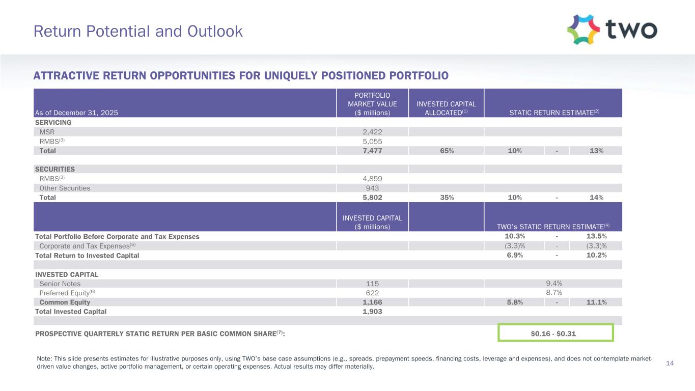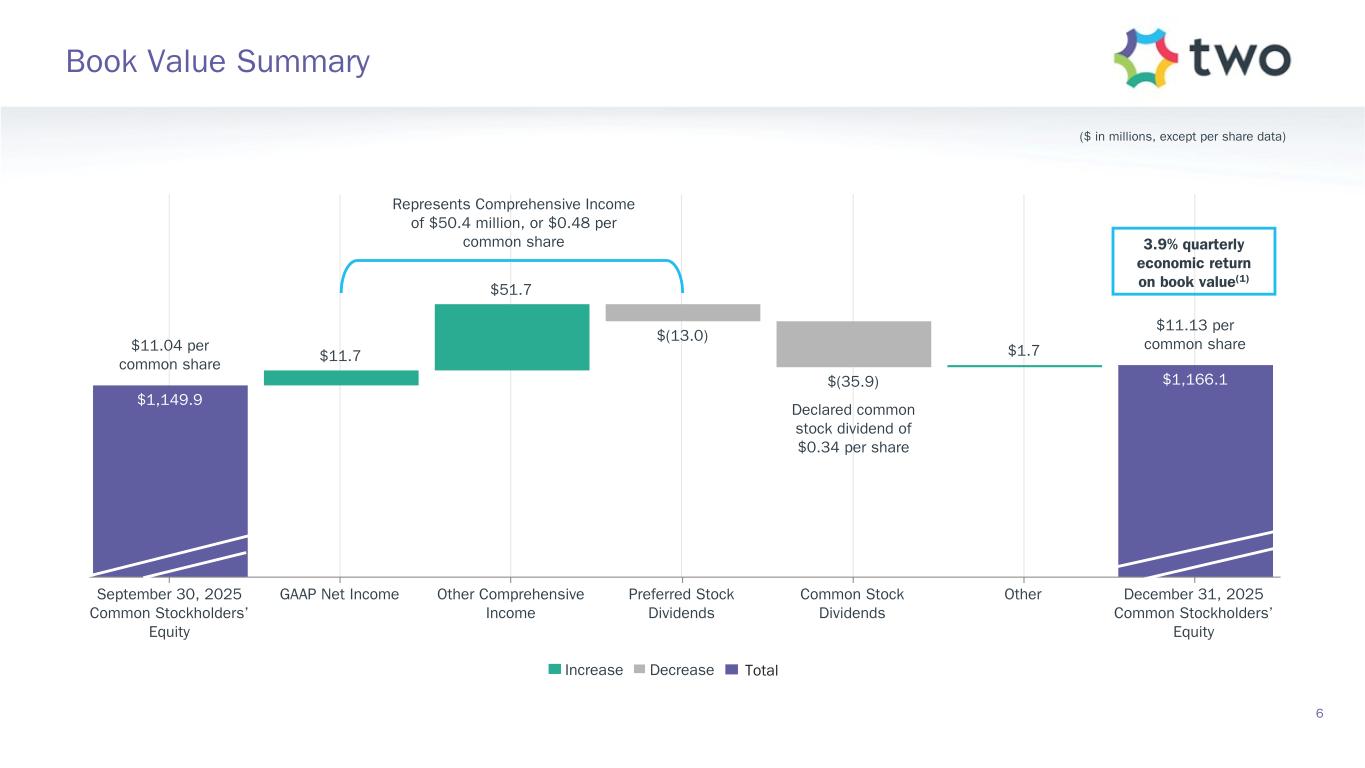 Note: Sensitivity data as of December 31, 2025. The above scenarios are provided for illustration purposes only and are not necessarily indicative of TWO’s financial condition and operating results, nor are they necessarily indicative of the financial condition or results of operations that may be expected for any future period or date. Book Value Exposure to Changes in Rates % Change in Common Book Value 2-Year Rate (basis points) 10-Year Rate (basis points) Agency P&I RMBS/TBA MSR/Agency IO RMBS(1) Other(2) Combined -25 0 Bull Steepener(3) 2.7 % 0.7 % (3.1) % 0.3 % 0 -25 Bull Flattener(4) 5.0 % (5.0) % (1.2) % (1.2) % -50 -50 Parallel Shift(5) 14.3 % (9.6) % (8.7) % (4.0) % -25 -25 Parallel Shift(5) 7.8 % (4.4) % (4.3) % (0.9) % 0 0 Base — % — % — % — % +25 +25 Parallel Shift(5) (9.0) % 3.8 % 4.1 % (1.1) % +50 +50 Parallel Shift(5) (19.2) % 6.4 % 7.9 % (4.9) % +25 0 Bear Flattener(3) (2.8) % (1.0) % 2.8 % (1.0) % 0 +25 Bear Steepener(4) (6.3) % 4.8 % 1.3 % (0.2) % Book Value Exposure to Current Coupon Spread(6) % Change in Common Book Value Parallel Shift in Spreads (basis points) Agency P&I RMBS/TBA MSR/Agency IO RMBS(1) Combined -25 7.4 % (3.7) % 3.7 % 0 — % — % — % +25 (8.5) % 4.5 % (4.0) % 17 Risk Positioning