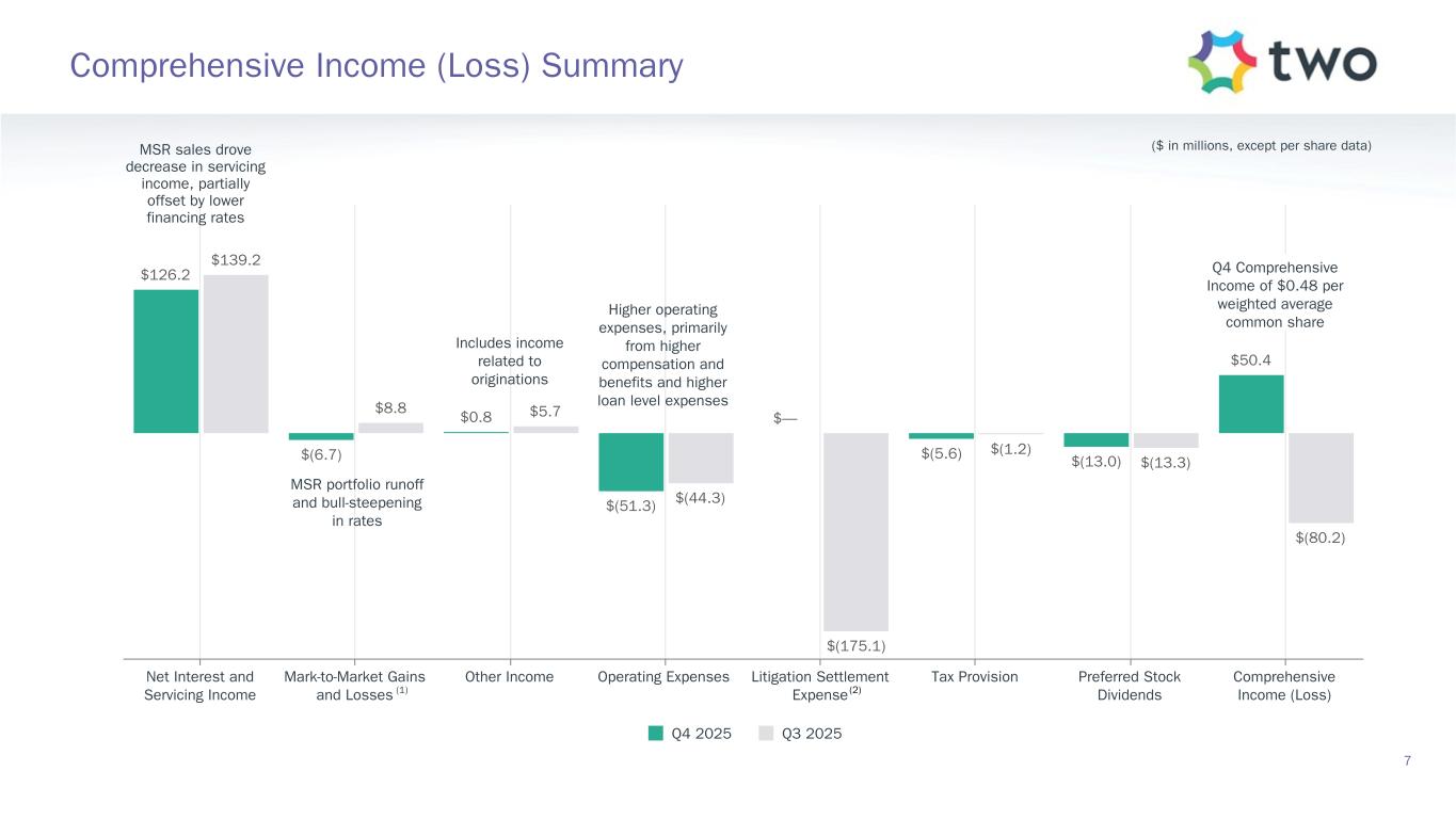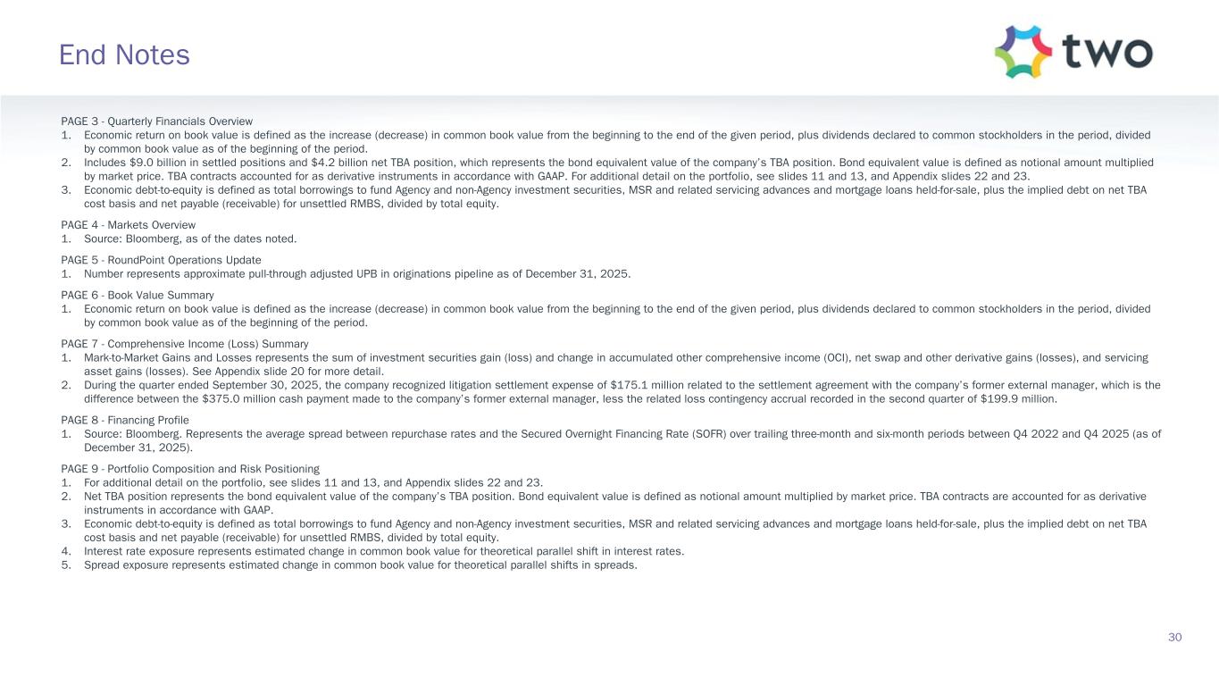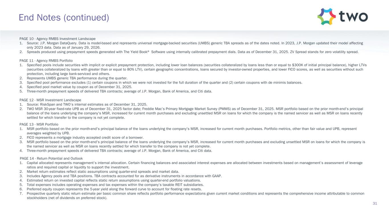 PAGE 10 - Agency RMBS Investment Landscape 1. Source: J.P. Morgan DataQuery. Data is model-based and represents universal mortgage-backed securities (UMBS) generic TBA spreads as of the dates noted. In 2023, J.P. Morgan updated their model affecting only 2023 data. Data as of January 29, 2026. 2. Spreads produced using prepayment speeds generated with The Yield Book® Software using internally calibrated prepayment dials. Data as of December 31, 2025. ZV Spread stands for zero volatility spread. PAGE 11 - Agency RMBS Portfolio 1. Specified pools include securities with implicit or explicit prepayment protection, including lower loan balances (securities collateralized by loans less than or equal to $300K of initial principal balance), higher LTVs (securities collateralized by loans with greater than or equal to 80% LTV), certain geographic concentrations, loans secured by investor-owned properties, and lower FICO scores, as well as securities without such protection, including large bank-serviced and others. 2. Represents UMBS generic TBA performance during the quarter. 3. Specified pool performance excludes (1) certain coupons in which we were not invested for the full duration of the quarter and (2) certain coupons with de minimis balances. 4. Specified pool market value by coupon as of December 31, 2025. 5. Three-month prepayment speeds of delivered TBA contracts; average of J.P. Morgan, Bank of America, and Citi data. PAGE 12 - MSR Investment Landscape 1. Source: RiskSpan and TWO’s internal estimates as of December 31, 2025. 2. TWO MSR 30-year fixed-rate UPB as of December 31, 2025 factor date; Freddie Mac’s Primary Mortgage Market Survey (PMMS) as of December 31, 2025. MSR portfolio based on the prior month-end's principal balance of the loans underlying the company's MSR, increased for current month purchases and excluding unsettled MSR on loans for which the company is the named servicer as well as MSR on loans recently settled for which transfer to the company is not yet complete. PAGE 13 - MSR Portfolio 1. MSR portfolio based on the prior month-end's principal balance of the loans underlying the company's MSR, increased for current month purchases. Portfolio metrics, other than fair value and UPB, represent averages weighted by UPB. 2. FICO represents a mortgage industry accepted credit score of a borrower. 3. MSR portfolio based on the prior month-end's principal balance of the loans underlying the company's MSR, increased for current month purchases and excluding unsettled MSR on loans for which the company is the named servicer as well as MSR on loans recently settled for which transfer to the company is not yet complete. 4. Three-month prepayment speeds of delivered TBA contracts; average of J.P. Morgan, Bank of America, and Citi data. PAGE 14 - Return Potential and Outlook 1. Capital allocated represents management’s internal allocation. Certain financing balances and associated interest expenses are allocated between investments based on management’s assessment of leverage ratios and required capital or liquidity to support the investment. 2. Market return estimates reflect static assumptions using quarter-end spreads and market data. 3. Includes Agency pools and TBA positions. TBA contracts accounted for as derivative instruments in accordance with GAAP. 4. Estimated return on invested capital reflects static return assumptions using quarter-end portfolio valuations. 5. Total expenses includes operating expenses and tax expenses within the company’s taxable REIT subsidiaries. 6. Preferred equity coupon represents the 5-year yield along the forward curve to account for floating rate resets. 7. Prospective quarterly static return estimate per basic common share reflects portfolio performance expectations given current market conditions and represents the comprehensive income attributable to common stockholders (net of dividends on preferred stock). 31 End Notes (continued)