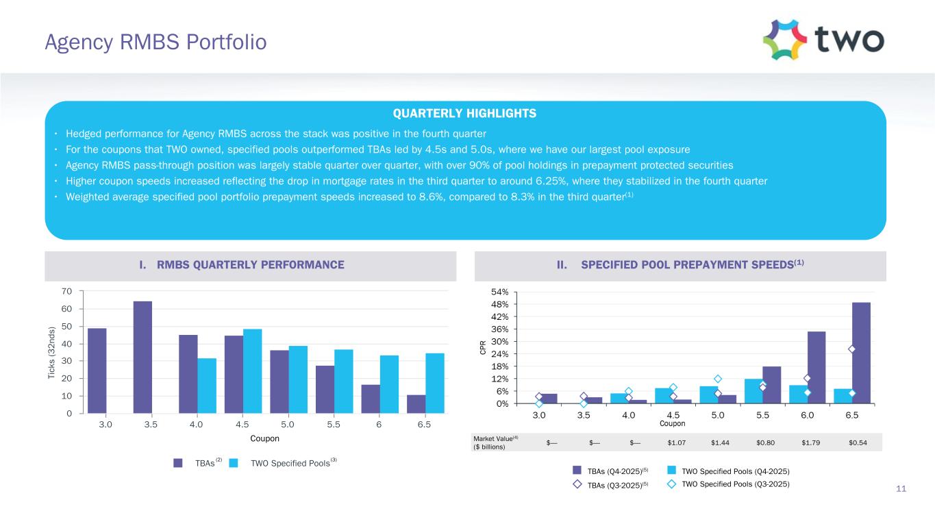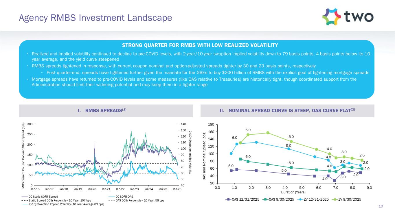 At December 31, 2025, $13.2 billion portfolio Includes $9.0 billion settled positions M ar ke t Va lu e Eq ui va le nt s ($ b ill io ns ) Econom ic D ebt-To-Equity 8.6 8.4 6.5 6.6 3.0 3.0 4.4 4.2 3.0 3.0 2.6 2.4 6.2x 7.0x 7.2x 7.0x Agency Net TBA Position MSR Economic Debt-to-Equity 3/31/2025 6/30/2025 9/30/2025 12/31/2025 0 5 10 15 20 25 0.0x 2.0x 4.0x 6.0x 8.0x (3) (3 ) (2) 13.213.5 14.6 14.4 Note: Sensitivity data as of December 31, 2025. The above scenarios are provided for illustration purposes only and are not necessarily indicative of TWO’s financial condition and operating results, nor are they necessarily indicative of the financial condition or results of operations that may be expected for any future period or date. See Slide 17 the Appendix for more information on our risk positioning. C ha ng e in c om m on bo ok v al ue (1.2)% (0.8)% (1.1)% (0.9)% 9/30/2025 12/31/2025 Up 25 basis points Down 25 basis points (2.0)% (1.0)% —% C ha ng e in c om m on bo ok v al ue (4.5)% 2.3% (4.0)% 3.7% 9/30/2025 12/31/2025 Up 25 basis points Down 25 basis points (8.0)% —% 8.0% 9 Portfolio Composition and Risk Positioning I. PORTFOLIO COMPOSITION(1) II. INTEREST RATE EXPOSURE(4) III. MORTGAGE SPREAD EXPOSURE(5)