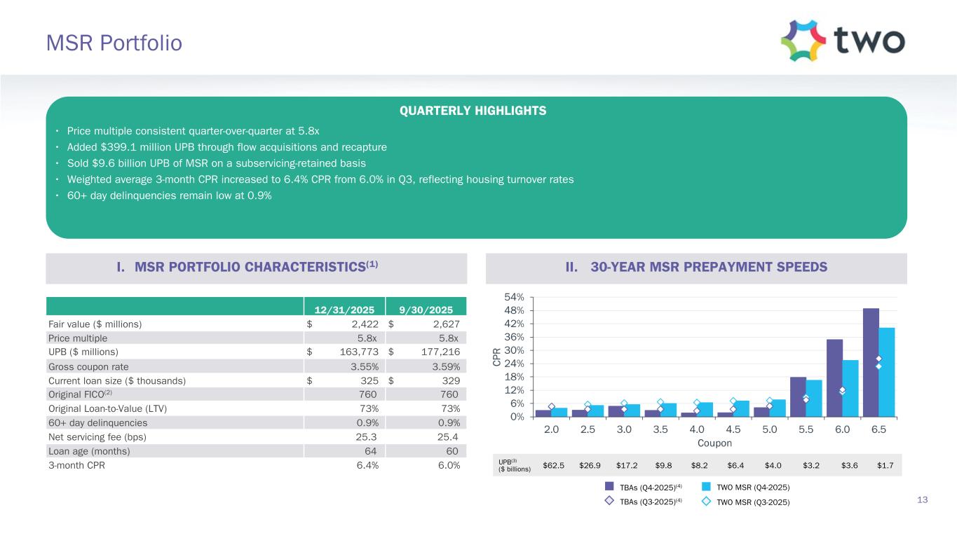 UPB(3) ($ billions) $62.5 $26.9 $17.2 $9.8 $8.2 $6.4 $4.0 $3.2 $3.6 $1.7 QUARTERLY HIGHLIGHTS • Price multiple consistent quarter-over-quarter at 5.8x • Added $399.1 million UPB through flow acquisitions and recapture • Sold $9.6 billion UPB of MSR on a subservicing-retained basis • Weighted average 3-month CPR increased to 6.4% CPR from 6.0% in Q3, reflecting housing turnover rates • 60+ day delinquencies remain low at 0.9% 12/31/2025 9/30/2025 Fair value ($ millions) $ 2,422 $ 2,627 Price multiple 5.8x 5.8x UPB ($ millions) $ 163,773 $ 177,216 Gross coupon rate 3.55 % 3.59 % Current loan size ($ thousands) $ 325 $ 329 Original FICO(2) 760 760 Original Loan-to-Value (LTV) 73 % 73 % 60+ day delinquencies 0.9 % 0.9 % Net servicing fee (bps) 25.3 25.4 Loan age (months) 64 60 3-month CPR 6.4 % 6.0 % TWO MSR (Q4-2025)TBAs (Q4-2025)(4) TBAs (Q3-2025)(4) TWO MSR (Q3-2025) 13 MSR Portfolio I. MSR PORTFOLIO CHARACTERISTICS(1) II. 30-YEAR MSR PREPAYMENT SPEEDS