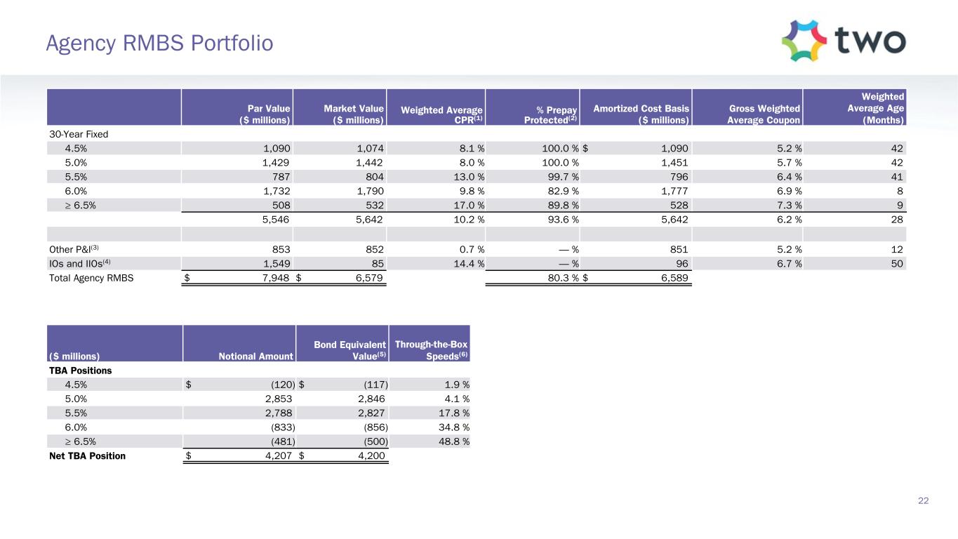 ($ thousands) Portfolio Asset Type Measure Average Amortized Cost Income(1) Average Yield Available-for-sale securities GAAP $ 6,589,521 $ 81,964 4.98% Mortgage loans held-for-sale GAAP 12,868 203 6.31% Adjustments to include other portfolio items: Mortgage servicing rights(2)(3) Non-GAAP 1,521,757 42,132 11.07% Agency derivatives(2)(4) Non-GAAP 102,738 3,877 15.09 % TBAs(2)(5) Non-GAAP 4,154,734 53,999 5.20 % Total portfolio Non-GAAP $ 12,381,618 $ 182,175 5.89% Financing Collateral Type Measure Average Outstanding Balance Expense(6) Average Cost Borrowings collateralized by available-for-sale securities GAAP $ 6,384,948 $ 68,104 4.27% Borrowings collateralized by mortgage loans held-for-sale GAAP 12,976 214 6.60 % Adjustments to include other financing items: Borrowings collateralized by mortgage servicing rights and advances GAAP 1,471,382 28,085 7.63 % Borrowings collateralized by Agency derivatives(4) GAAP 76,191 890 4.67 % Senior notes(7) GAAP 110,991 2,884 10.39 % Convertible senior notes(8) GAAP 261,663 4,532 6.93 % Interest rate swaps(2)(9) Non-GAAP (4,167) (0.13) % U.S. Treasury futures(2)(10) Non-GAAP (4,471) (0.14) % TBAs(2)(5) Non-GAAP 4,154,734 41,590 4.00 % Total financing Non-GAAP $ 12,472,885 $ 137,661 4.41 % Net Spread Measure Average Yield, less Cost Net spread on AFS securities and mortgage loans held-for-sale GAAP 0.71% Net spread on total portfolio Non-GAAP 1.48% 21 Q4-2025 Portfolio Yields and Financing Costs