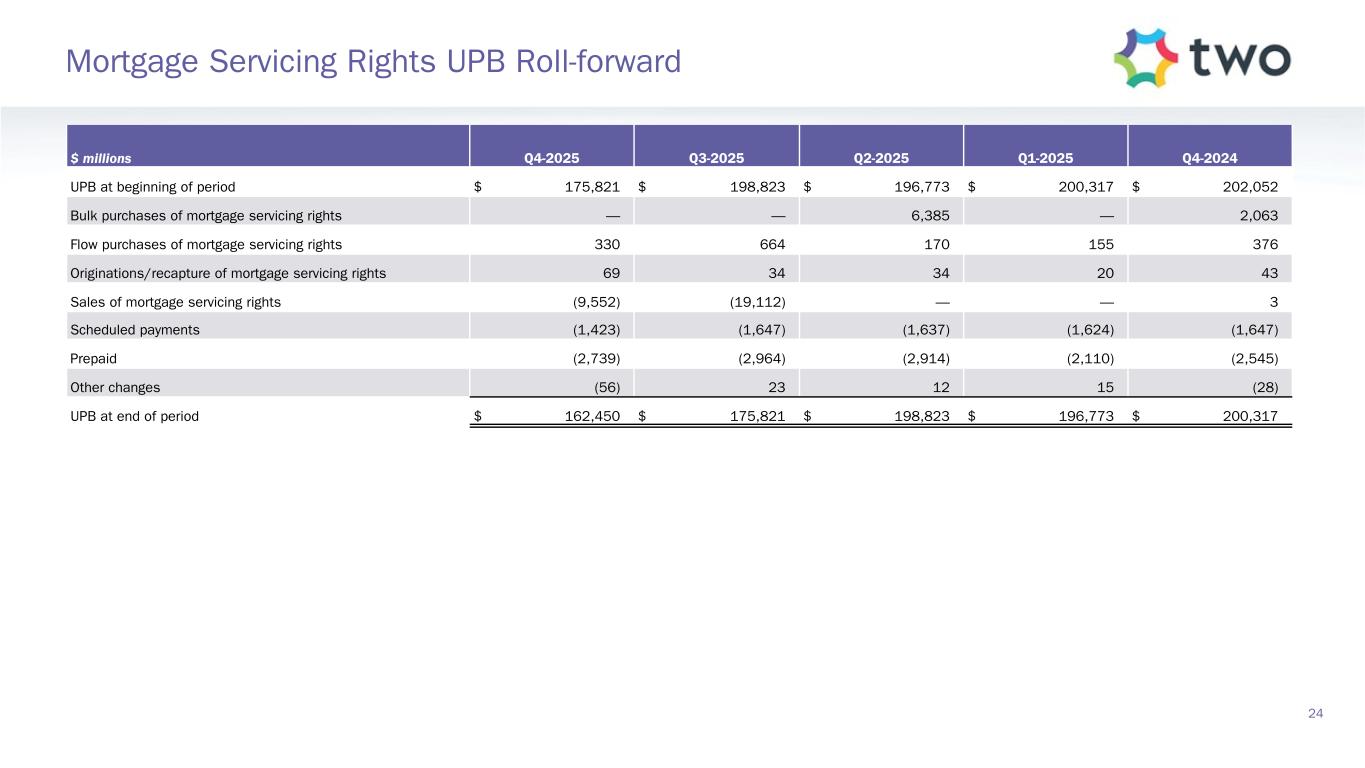 $ millions Q4-2025 Q3-2025 Q2-2025 Q1-2025 Q4-2024 UPB at beginning of period $ 175,821 $ 198,823 $ 196,773 $ 200,317 $ 202,052 Bulk purchases of mortgage servicing rights — — 6,385 — 2,063 Flow purchases of mortgage servicing rights 330 664 170 155 376 Originations/recapture of mortgage servicing rights 69 34 34 20 43 Sales of mortgage servicing rights (9,552) (19,112) — — 3 Scheduled payments (1,423) (1,647) (1,637) (1,624) (1,647) Prepaid (2,739) (2,964) (2,914) (2,110) (2,545) Other changes (56) 23 12 15 (28) UPB at end of period $ 162,450 $ 175,821 $ 198,823 $ 196,773 $ 200,317 24 Mortgage Servicing Rights UPB Roll-forward