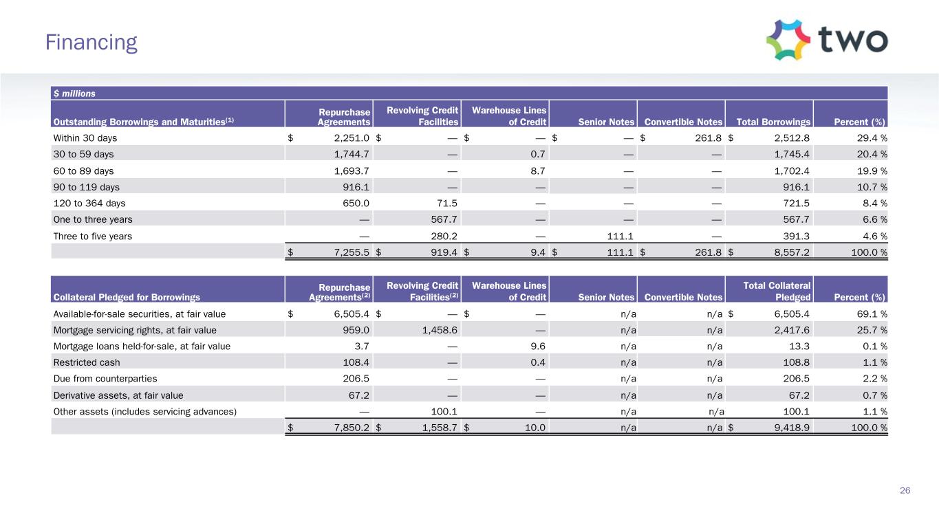 $ millions Outstanding Borrowings and Maturities(1) Repurchase Agreements Revolving Credit Facilities Warehouse Lines of Credit Senior Notes Convertible Notes Total Borrowings Percent (%) Within 30 days $ 2,251.0 $ — $ — $ — $ 261.8 $ 2,512.8 29.4 % 30 to 59 days 1,744.7 — 0.7 — — 1,745.4 20.4 % 60 to 89 days 1,693.7 — 8.7 — — 1,702.4 19.9 % 90 to 119 days 916.1 — — — — 916.1 10.7 % 120 to 364 days 650.0 71.5 — — — 721.5 8.4 % One to three years — 567.7 — — — 567.7 6.6 % Three to five years — 280.2 — 111.1 — 391.3 4.6 % $ 7,255.5 $ 919.4 $ 9.4 $ 111.1 $ 261.8 $ 8,557.2 100.0 % Collateral Pledged for Borrowings Repurchase Agreements(2) Revolving Credit Facilities(2) Warehouse Lines of Credit Senior Notes Convertible Notes Total Collateral Pledged Percent (%) Available-for-sale securities, at fair value $ 6,505.4 $ — $ — n/a n/a $ 6,505.4 69.1 % Mortgage servicing rights, at fair value 959.0 1,458.6 — n/a n/a 2,417.6 25.7 % Mortgage loans held-for-sale, at fair value 3.7 — 9.6 n/a n/a 13.3 0.1 % Restricted cash 108.4 — 0.4 n/a n/a 108.8 1.1 % Due from counterparties 206.5 — — n/a n/a 206.5 2.2 % Derivative assets, at fair value 67.2 — — n/a n/a 67.2 0.7 % Other assets (includes servicing advances) — 100.1 — n/a n/a 100.1 1.1 % $ 7,850.2 $ 1,558.7 $ 10.0 n/a n/a $ 9,418.9 100.0 % 26 Financing