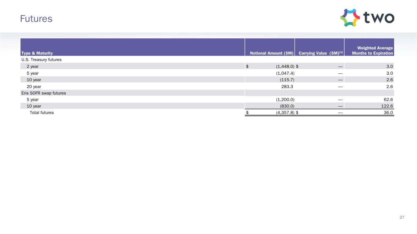 Type & Maturity Notional Amount ($M) Carrying Value ($M)(1) Weighted Average Months to Expiration U.S. Treasury futures 2 year $ (1,448.0) $ — 3.0 5 year (1,047.4) — 3.0 10 year (115.7) — 2.6 20 year 283.3 — 2.6 Eris SOFR swap futures 5 year (1,200.0) — 62.6 10 year (830.0) — 122.6 Total futures $ (4,357.8) $ — 36.0 27 Futures