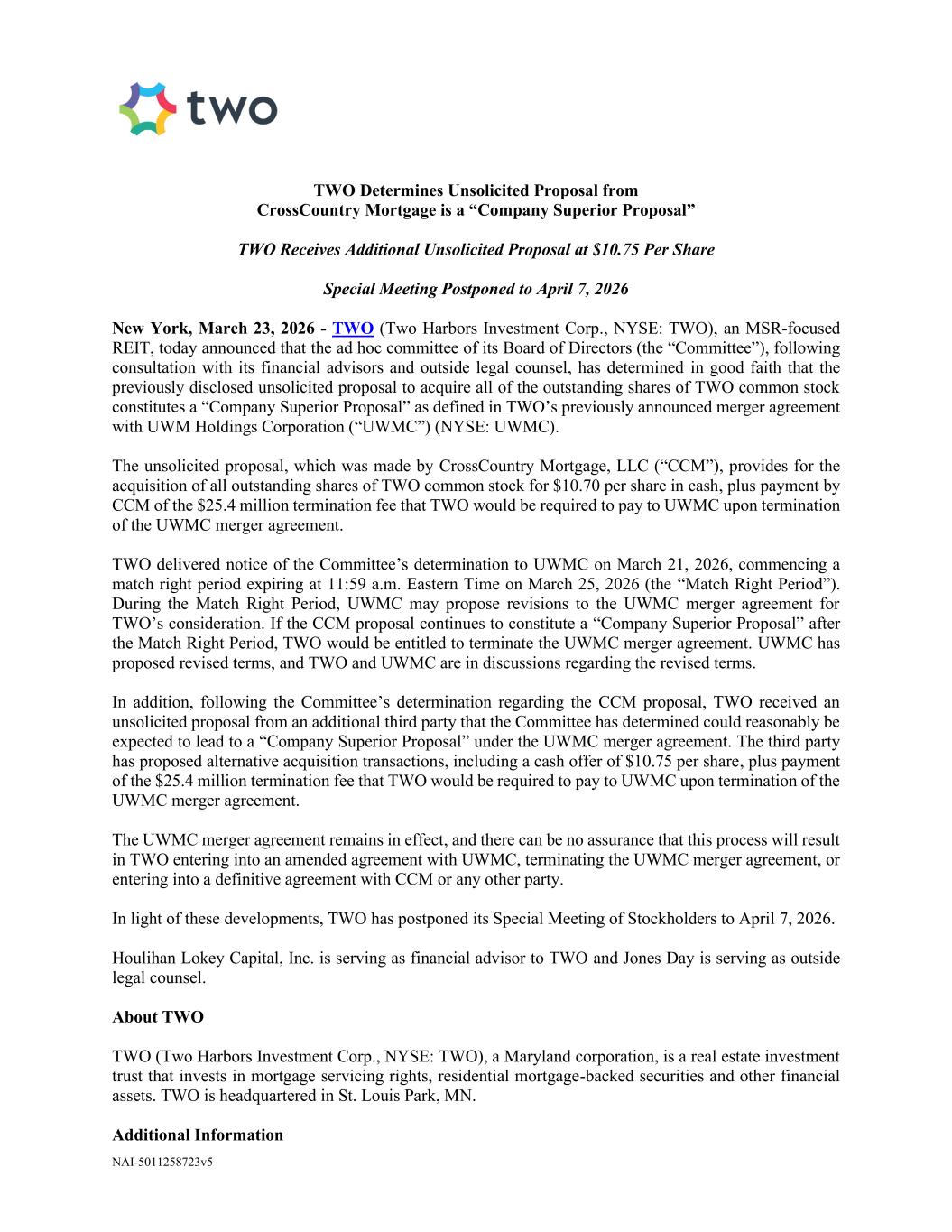 NAI-5011258723v5 TWO Determines Unsolicited Proposal from CrossCountry Mortgage is a “Company Superior Proposal” TWO Receives Additional Unsolicited Proposal at $10.75 Per Share Special Meeting Postponed to April 7, 2026 New York, March 23, 2026 - TWO (Two Harbors Investment Corp., NYSE: TWO), an MSR-focused REIT, today announced that the ad hoc committee of its Board of Directors (the “Committee”), following consultation with its financial advisors and outside legal counsel, has determined in good faith that the previously disclosed unsolicited proposal to acquire all of the outstanding shares of TWO common stock constitutes a “Company Superior Proposal” as defined in TWO’s previously announced merger agreement with UWM Holdings Corporation (“UWMC”) (NYSE: UWMC). The unsolicited proposal, which was made by CrossCountry Mortgage, LLC (“CCM”), provides for the acquisition of all outstanding shares of TWO common stock for $10.70 per share in cash, plus payment by CCM of the $25.4 million termination fee that TWO would be required to pay to UWMC upon termination of the UWMC merger agreement. TWO delivered notice of the Committee’s determination to UWMC on March 21, 2026, commencing a match right period expiring at 11:59 a.m. Eastern Time on March 25, 2026 (the “Match Right Period”). During the Match Right Period, UWMC may propose revisions to the UWMC merger agreement for TWO’s consideration. If the CCM proposal continues to constitute a “Company Superior Proposal” after the Match Right Period, TWO would be entitled to terminate the UWMC merger agreement. UWMC has proposed revised terms, and TWO and UWMC are in discussions regarding the revised terms. In addition, following the Committee’s determination regarding the CCM proposal, TWO received an unsolicited proposal from an additional third party that the Committee has determined could reasonably be expected to lead to a “Company Superior Proposal” under the UWMC merger agreement. The third party has proposed alternative acquisition transactions, including a cash offer of $10.75 per share, plus payment of the $25.4 million termination fee that TWO would be required to pay to UWMC upon termination of the UWMC merger agreement. The UWMC merger agreement remains in effect, and there can be no assurance that this process will result in TWO entering into an amended agreement with UWMC, terminating the UWMC merger agreement, or entering into a definitive agreement with CCM or any other party. In light of these developments, TWO has postponed its Special Meeting of Stockholders to April 7, 2026. Houlihan Lokey Capital, Inc. is serving as financial advisor to TWO and Jones Day is serving as outside legal counsel. About TWO TWO (Two Harbors Investment Corp., NYSE: TWO), a Maryland corporation, is a real estate investment trust that invests in mortgage servicing rights, residential mortgage-backed securities and other financial assets. TWO is headquartered in St. Louis Park, MN. Additional Information