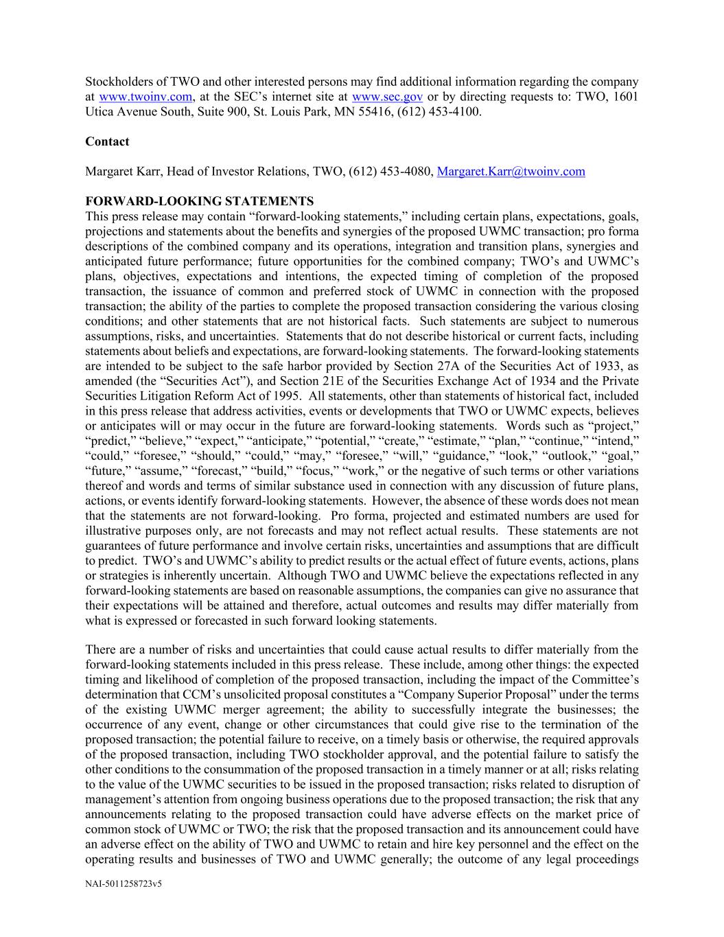 NAI-5011258723v5 Stockholders of TWO and other interested persons may find additional information regarding the company at www.twoinv.com, at the SEC’s internet site at www.sec.gov or by directing requests to: TWO, 1601 Utica Avenue South, Suite 900, St. Louis Park, MN 55416, (612) 453-4100. Contact Margaret Karr, Head of Investor Relations, TWO, (612) 453-4080, Margaret.Karr@twoinv.com FORWARD-LOOKING STATEMENTS This press release may contain “forward-looking statements,” including certain plans, expectations, goals, projections and statements about the benefits and synergies of the proposed UWMC transaction; pro forma descriptions of the combined company and its operations, integration and transition plans, synergies and anticipated future performance; future opportunities for the combined company; TWO’s and UWMC’s plans, objectives, expectations and intentions, the expected timing of completion of the proposed transaction, the issuance of common and preferred stock of UWMC in connection with the proposed transaction; the ability of the parties to complete the proposed transaction considering the various closing conditions; and other statements that are not historical facts. Such statements are subject to numerous assumptions, risks, and uncertainties. Statements that do not describe historical or current facts, including statements about beliefs and expectations, are forward-looking statements. The forward-looking statements are intended to be subject to the safe harbor provided by Section 27A of the Securities Act of 1933, as amended (the “Securities Act”), and Section 21E of the Securities Exchange Act of 1934 and the Private Securities Litigation Reform Act of 1995. All statements, other than statements of historical fact, included in this press release that address activities, events or developments that TWO or UWMC expects, believes or anticipates will or may occur in the future are forward-looking statements. Words such as “project,” “predict,” “believe,” “expect,” “anticipate,” “potential,” “create,” “estimate,” “plan,” “continue,” “intend,” “could,” “foresee,” “should,” “could,” “may,” “foresee,” “will,” “guidance,” “look,” “outlook,” “goal,” “future,” “assume,” “forecast,” “build,” “focus,” “work,” or the negative of such terms or other variations thereof and words and terms of similar substance used in connection with any discussion of future plans, actions, or events identify forward-looking statements. However, the absence of these words does not mean that the statements are not forward-looking. Pro forma, projected and estimated numbers are used for illustrative purposes only, are not forecasts and may not reflect actual results. These statements are not guarantees of future performance and involve certain risks, uncertainties and assumptions that are difficult to predict. TWO’s and UWMC’s ability to predict results or the actual effect of future events, actions, plans or strategies is inherently uncertain. Although TWO and UWMC believe the expectations reflected in any forward-looking statements are based on reasonable assumptions, the companies can give no assurance that their expectations will be attained and therefore, actual outcomes and results may differ materially from what is expressed or forecasted in such forward looking statements. There are a number of risks and uncertainties that could cause actual results to differ materially from the forward-looking statements included in this press release. These include, among other things: the expected timing and likelihood of completion of the proposed transaction, including the impact of the Committee’s determination that CCM’s unsolicited proposal constitutes a “Company Superior Proposal” under the terms of the existing UWMC merger agreement; the ability to successfully integrate the businesses; the occurrence of any event, change or other circumstances that could give rise to the termination of the proposed transaction; the potential failure to receive, on a timely basis or otherwise, the required approvals of the proposed transaction, including TWO stockholder approval, and the potential failure to satisfy the other conditions to the consummation of the proposed transaction in a timely manner or at all; risks relating to the value of the UWMC securities to be issued in the proposed transaction; risks related to disruption of management’s attention from ongoing business operations due to the proposed transaction; the risk that any announcements relating to the proposed transaction could have adverse effects on the market price of common stock of UWMC or TWO; the risk that the proposed transaction and its announcement could have an adverse effect on the ability of TWO and UWMC to retain and hire key personnel and the effect on the operating results and businesses of TWO and UWMC generally; the outcome of any legal proceedings