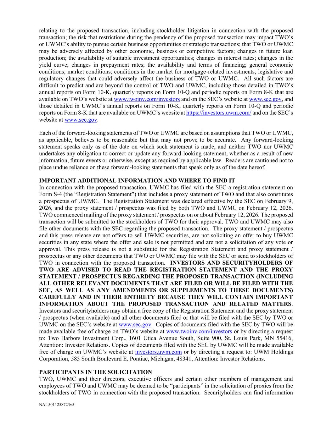 NAI-5011258723v5 relating to the proposed transaction, including stockholder litigation in connection with the proposed transaction; the risk that restrictions during the pendency of the proposed transaction may impact TWO’s or UWMC’s ability to pursue certain business opportunities or strategic transactions; that TWO or UWMC may be adversely affected by other economic, business or competitive factors; changes in future loan production; the availability of suitable investment opportunities; changes in interest rates; changes in the yield curve; changes in prepayment rates; the availability and terms of financing; general economic conditions; market conditions; conditions in the market for mortgage-related investments; legislative and regulatory changes that could adversely affect the business of TWO or UWMC. All such factors are difficult to predict and are beyond the control of TWO and UWMC, including those detailed in TWO’s annual reports on Form 10-K, quarterly reports on Form 10-Q and periodic reports on Form 8-K that are available on TWO’s website at www.twoinv.com/investors and on the SEC’s website at www.sec.gov, and those detailed in UWMC’s annual reports on Form 10-K, quarterly reports on Form 10-Q and periodic reports on Form 8-K that are available on UWMC’s website at https://investors.uwm.com/ and on the SEC’s website at www.sec.gov. Each of the forward-looking statements of TWO or UWMC are based on assumptions that TWO or UWMC, as applicable, believes to be reasonable but that may not prove to be accurate. Any forward-looking statement speaks only as of the date on which such statement is made, and neither TWO nor UWMC undertakes any obligation to correct or update any forward-looking statement, whether as a result of new information, future events or otherwise, except as required by applicable law. Readers are cautioned not to place undue reliance on these forward-looking statements that speak only as of the date hereof. IMPORTANT ADDITIONAL INFORMATION AND WHERE TO FIND IT In connection with the proposed transaction, UWMC has filed with the SEC a registration statement on Form S-4 (the “Registration Statement”) that includes a proxy statement of TWO and that also constitutes a prospectus of UWMC. The Registration Statement was declared effective by the SEC on February 9, 2026, and the proxy statement / prospectus was filed by both TWO and UWMC on February 12, 2026. TWO commenced mailing of the proxy statement / prospectus on or about February 12, 2026. The proposed transaction will be submitted to the stockholders of TWO for their approval. TWO and UWMC may also file other documents with the SEC regarding the proposed transaction. The proxy statement / prospectus and this press release are not offers to sell UWMC securities, are not soliciting an offer to buy UWMC securities in any state where the offer and sale is not permitted and are not a solicitation of any vote or approval. This press release is not a substitute for the Registration Statement and proxy statement / prospectus or any other documents that TWO or UWMC may file with the SEC or send to stockholders of TWO in connection with the proposed transaction. INVESTORS AND SECURITYHOLDERS OF TWO ARE ADVISED TO READ THE REGISTRATION STATEMENT AND THE PROXY STATEMENT / PROSPECTUS REGARDING THE PROPOSED TRANSACTION (INCLUDING ALL OTHER RELEVANT DOCUMENTS THAT ARE FILED OR WILL BE FILED WITH THE SEC, AS WELL AS ANY AMENDMENTS OR SUPPLEMENTS TO THESE DOCUMENTS) CAREFULLY AND IN THEIR ENTIRETY BECAUSE THEY WILL CONTAIN IMPORTANT INFORMATION ABOUT THE PROPOSED TRANSACTION AND RELATED MATTERS. Investors and securityholders may obtain a free copy of the Registration Statement and the proxy statement / prospectus (when available) and all other documents filed or that will be filed with the SEC by TWO or UWMC on the SEC’s website at www.sec.gov. Copies of documents filed with the SEC by TWO will be made available free of charge on TWO’s website at www.twoinv.com/investors or by directing a request to: Two Harbors Investment Corp., 1601 Utica Avenue South, Suite 900, St. Louis Park, MN 55416, Attention: Investor Relations. Copies of documents filed with the SEC by UWMC will be made available free of charge on UWMC’s website at investors.uwm.com or by directing a request to: UWM Holdings Corporation, 585 South Boulevard E. Pontiac, Michigan, 48341, Attention: Investor Relations. PARTICIPANTS IN THE SOLICITATION TWO, UWMC and their directors, executive officers and certain other members of management and employees of TWO and UWMC may be deemed to be “participants” in the solicitation of proxies from the stockholders of TWO in connection with the proposed transaction. Securityholders can find information
