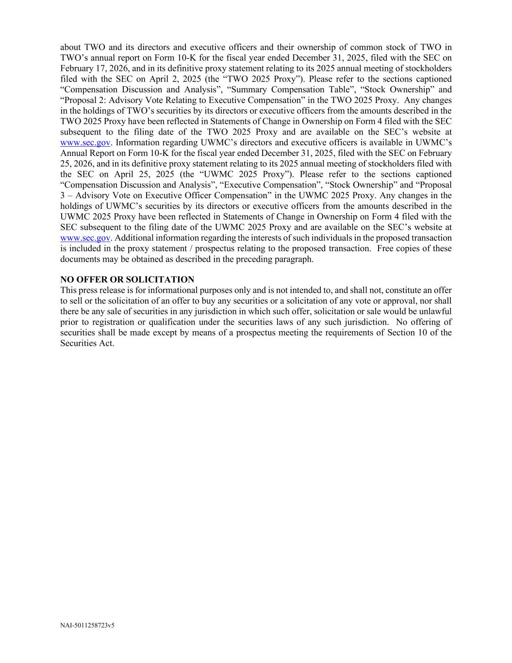 NAI-5011258723v5 about TWO and its directors and executive officers and their ownership of common stock of TWO in TWO’s annual report on Form 10-K for the fiscal year ended December 31, 2025, filed with the SEC on February 17, 2026, and in its definitive proxy statement relating to its 2025 annual meeting of stockholders filed with the SEC on April 2, 2025 (the “TWO 2025 Proxy”). Please refer to the sections captioned “Compensation Discussion and Analysis”, “Summary Compensation Table”, “Stock Ownership” and “Proposal 2: Advisory Vote Relating to Executive Compensation” in the TWO 2025 Proxy. Any changes in the holdings of TWO’s securities by its directors or executive officers from the amounts described in the TWO 2025 Proxy have been reflected in Statements of Change in Ownership on Form 4 filed with the SEC subsequent to the filing date of the TWO 2025 Proxy and are available on the SEC’s website at www.sec.gov. Information regarding UWMC’s directors and executive officers is available in UWMC’s Annual Report on Form 10-K for the fiscal year ended December 31, 2025, filed with the SEC on February 25, 2026, and in its definitive proxy statement relating to its 2025 annual meeting of stockholders filed with the SEC on April 25, 2025 (the “UWMC 2025 Proxy”). Please refer to the sections captioned “Compensation Discussion and Analysis”, “Executive Compensation”, “Stock Ownership” and “Proposal 3 – Advisory Vote on Executive Officer Compensation” in the UWMC 2025 Proxy. Any changes in the holdings of UWMC’s securities by its directors or executive officers from the amounts described in the UWMC 2025 Proxy have been reflected in Statements of Change in Ownership on Form 4 filed with the SEC subsequent to the filing date of the UWMC 2025 Proxy and are available on the SEC’s website at www.sec.gov. Additional information regarding the interests of such individuals in the proposed transaction is included in the proxy statement / prospectus relating to the proposed transaction. Free copies of these documents may be obtained as described in the preceding paragraph. NO OFFER OR SOLICITATION This press release is for informational purposes only and is not intended to, and shall not, constitute an offer to sell or the solicitation of an offer to buy any securities or a solicitation of any vote or approval, nor shall there be any sale of securities in any jurisdiction in which such offer, solicitation or sale would be unlawful prior to registration or qualification under the securities laws of any such jurisdiction. No offering of securities shall be made except by means of a prospectus meeting the requirements of Section 10 of the Securities Act.