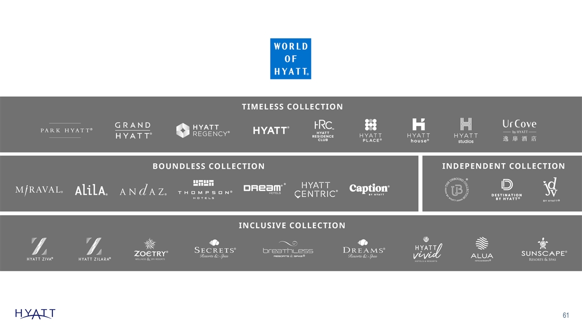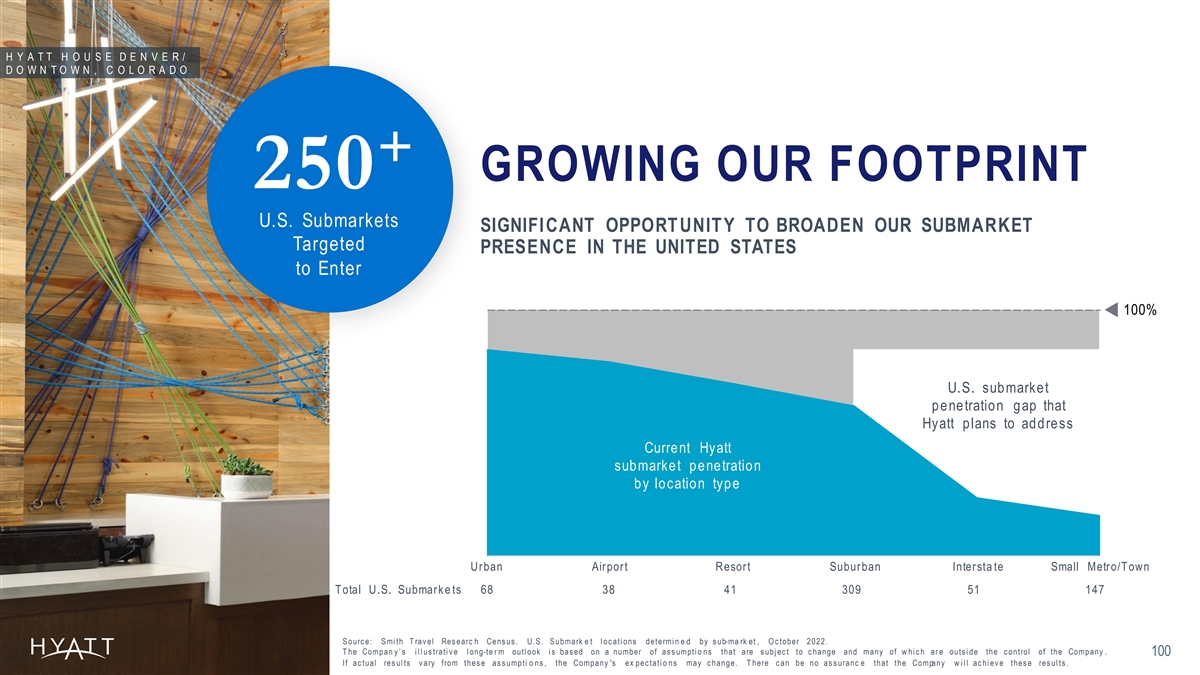 H Y A T T H O U S E D E N V E R / D O W N T O W N , C O L O R A D O + GROWING OUR FOOTPRINT 250 U.S. Submarkets SIGNIFICANT OPPORT UNIT Y TO BROADEN OUR SUBMARKET Targeted PRESENCE IN THE UNITED STATES to Enter 100% U.S. submarket penetration gap that Hyatt plans to address Current Hyatt submarket penetration by location type Urban Airport Resort Suburban Intersta te Small Metro/Town Total U.S. Submark e ts 68 38 41 309 51 147 S ourc e: S mi th T rav el Res earc h Cens us . U.S . S ubmark e t l oc ati ons determi n e d by s ub-ma rk et , O c tober 2022. T he Compan y ’ s i l l us trati v e l ong-te r m outl ook i s bas ed on a number of as s umpti o ns that are s ubj ec t to c hange and many of w hi c h ar e outs i de the c ontrol of the Company . 100 If ac tual res ul ts v ary from thes e as s umpti o ns , the Company 's ex pec tati o ns may c hange. T here c an be no as s uranc e that the Company w i l l ac hi ev e thes e res ul ts .