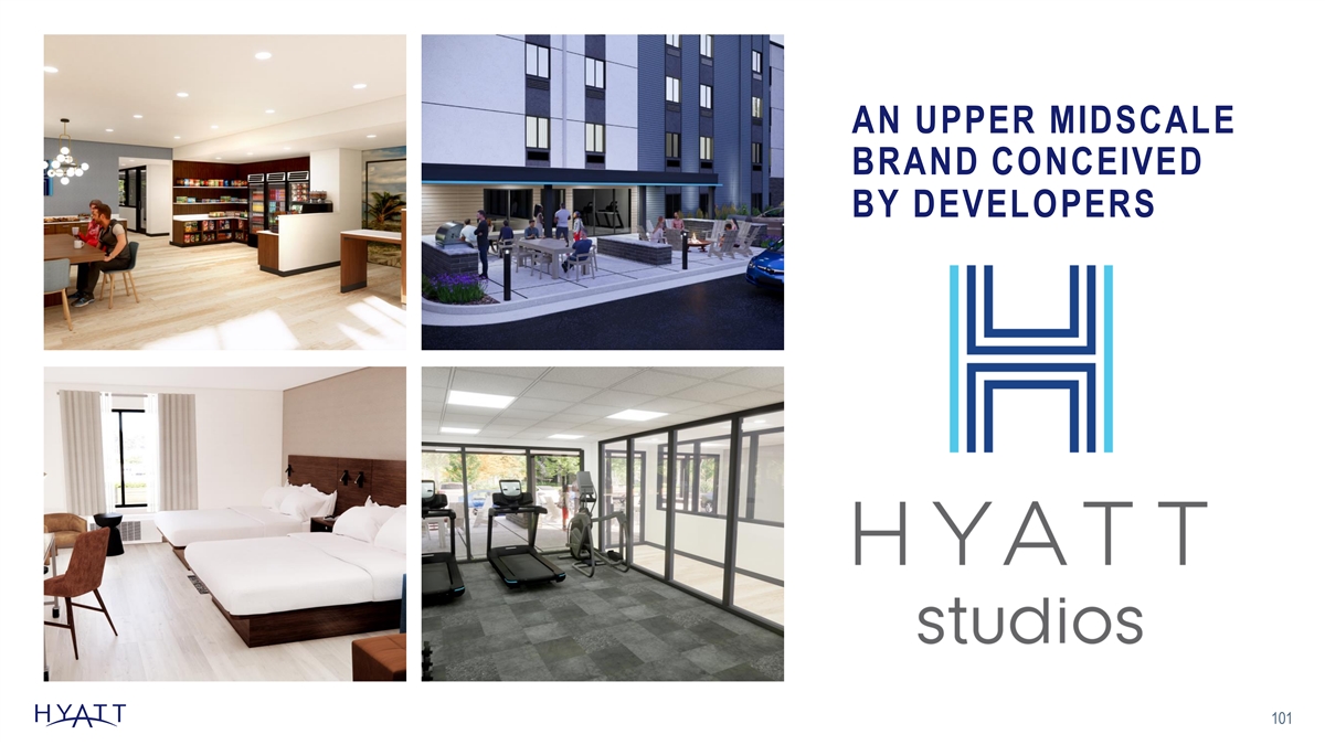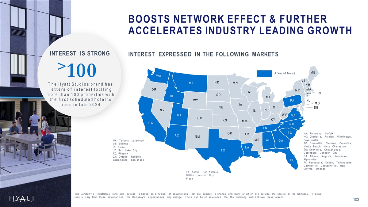 BOOSTS NETWORK EFFECT & FURTHER ACCELERATES INDUSTRY LEADING GROWTH INTEREST IS STRONG INTEREST EXPRESSE D IN THE FOLLOWING MARKET S > ME A r e a o f f o c u s 100 WA VT ND MN MT T h e H y a t t S t u d i o s b r a n d h a s NH OR MA l e t t e r s o f i n t e r e s t t o t a l i n g NY WI RI CT SD m o r e t h a n 1 0 0 p r o p e r t i e s w i th ID MI t h e f i r s t s c h e d u l e d h o t e l t o WY PA NJ MD IA o p e n i n l a t e 2 0 2 4 NE OH DE IN NV IL WV UT VA CO KY KS MO CA NC TN SC OK V A : Ri c hmond , Norfol k AR AZ NM NC: Charl ot t e, Ral ei gh, Wi l mi ngton , MS F ay ettev i l l e WA : T ac oma, Lak ew ood AL GA S C: G reenv i l l e , Cl ems on , Col umbi a, MT : B i l l i ngs My rtl e B eac h, North Charl es t o n ID: B oi s e LA T N: K nox v i l l e, Chattan o og a , UT : S al t Lak e Ci ty TX G atl i nbu rg , J ohns on Ci ty A Z : P hoeni x G A : A thens , A ugus ta, K ennes aw , CA : O ntari o, Reddi ng, A l phare tt a S ac rame n to , S an Di ego FL F L: P ens ac ol a, Des ti n, T al l ahas s e e, G ai nes v i l l e, J ac k s onv i l l e , New S my rna, O rl ando T X : A us ti n, S an A ntoni o , Dal l as , Hous ton Ci ty P l ac e T he Compan y ’ s i l l us trati v e l ong -te r m outl ook i s bas ed on a number of as s umpti o ns that are s ubj ec t to c hange and many of w hi c h ar e outs i de the c ontrol of the Company . If ac tual res ul ts v ary from thes e as s umpti o ns , the Company 's ex pec tati o ns may c hange. T here c an be no as s uranc e that the Company w i l l a c hi ev e thes e res ul ts . 103 103