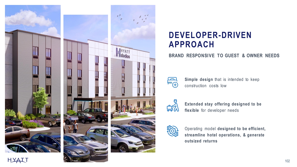 DEVELOPER-DRIVEN APPROACH BRAND RESPONSIVE TO GUEST & OWNER NEEDS Simple design that is intended to keep construction costs low Extended stay offering designed to be flexible for developer needs Operating model designed to be efficient, streamline hotel operations, & generate outsized returns 102