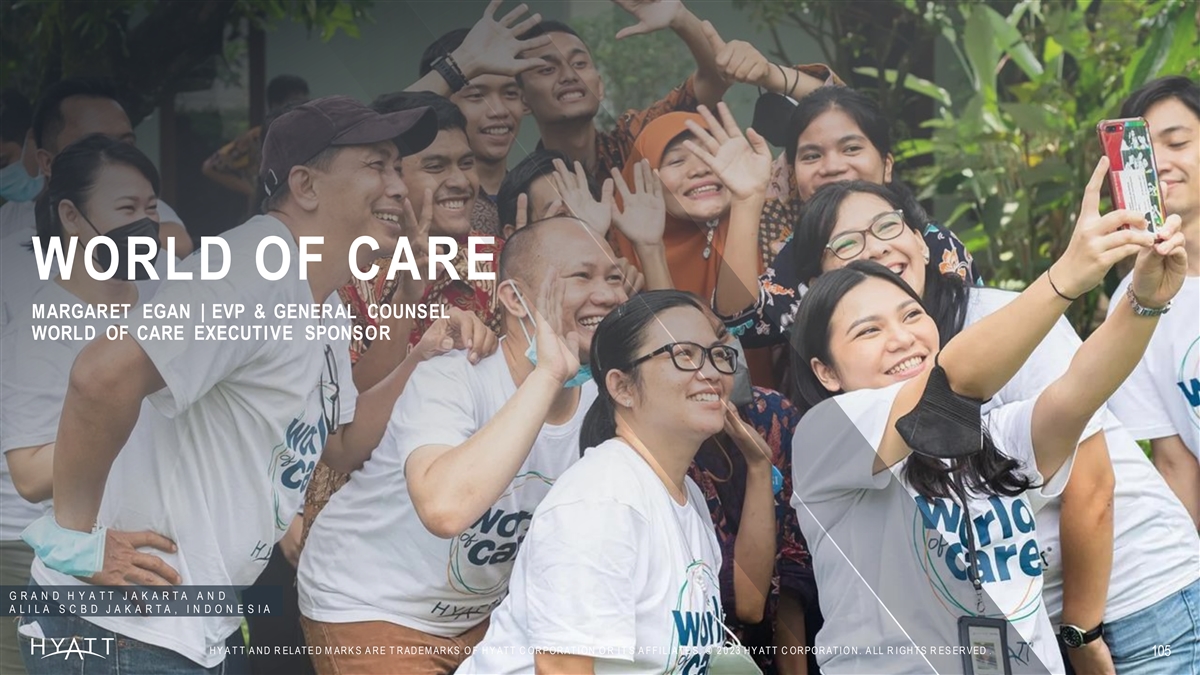 WORLD OF CARE MARGARET EGAN | EVP & GENERAL COUNSEL WORLD OF CARE EXECUTIVE SPONSOR G R A N D H Y A T T J A K A R T A A N D A L I L A S C B D J A K A R T A , I N D O N E S I A H Y A T T A N D R ELAT E D M AR K S A R E T R AD EM AR KS O F H Y AT T C OR POR AT I ON O R I T S A F F I LI AT E S. © 2 0 23 H Y AT T C OR POR AT I O N . A LL R I GH T S R ES ER VED . 105