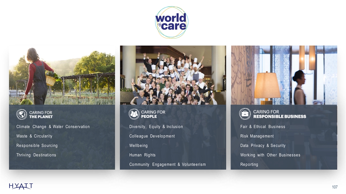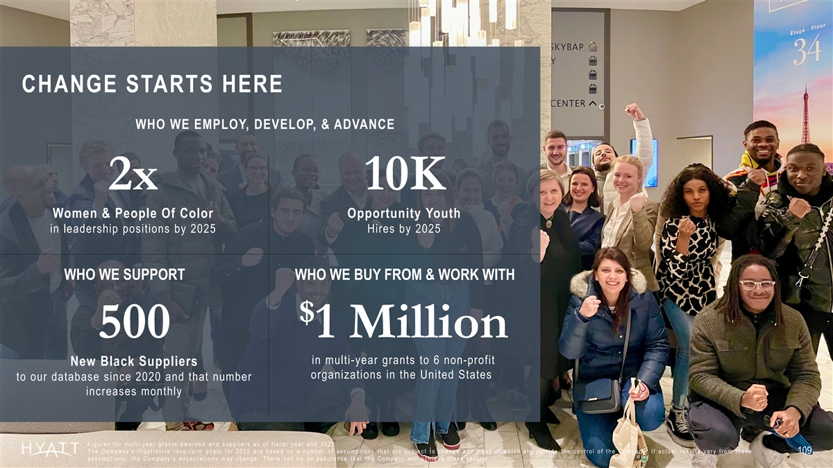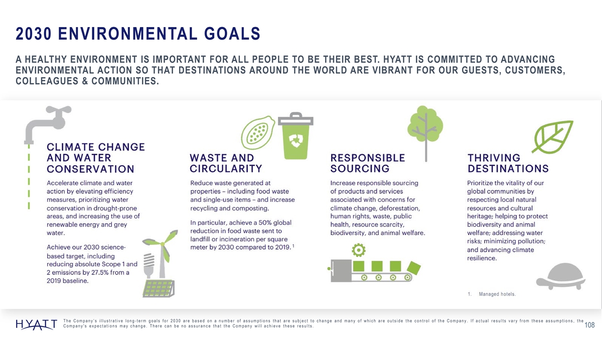 2030 ENVIRONMENTAL GOALS A HEALTHY ENVIRONMENT IS IMPORTANT FOR ALL PEOPLE TO BE THEIR BEST. HYATT IS COMMITTED TO ADVANCING ENVIRONMENTAL ACTION SO THAT DESTINATIONS AROUND THE WORLD ARE VIBRANT FOR OUR GUESTS, CUSTOMERS, COLLEAGUES & COMMUNITIES. The Company’s illustrative long -term goals for 2030 are based on a number of assumptions that are subject to change and many of which are outside the control of the Company. If actual results vary from these assumptions, the Company's expectations may change. There can be no assurance that the Company will achieve these results. 108