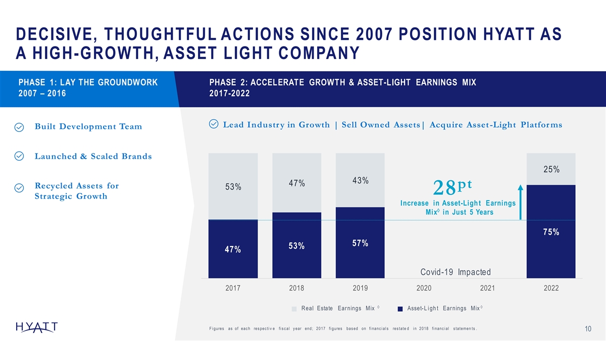 HYATT’S INTENTIONAL EVOLUTION YESTERDAY TODAY TOMORROW 2009 2022 2025 ~$ $ 750M $ 60M 473M † † Free Cash Flow F ree C as h F low † Free C ash Flow > 1,500 1,263 Hotels 399 H otels Hotels % > % 75 80 37% à à1 A sset-Lig h t E arnings M ix As s et-Light Earnings M ix à Asset-Lig h t Earnings Mix 1ààà A s s et-Li g ht E arni ngs Mi x for 2009 does not i nc l ude Net Deferr al s and Net F i nanc ed Contrac ts i n the c al c ul ati on . F i gures as of eac h res pec ti v e fi s c al y ear end. 9 T he Compan y ’ s i l l us trati v e l ong -te r m F ree Cas h F l ow outl ook and i l l us trati v e l ong -te r m outl ook for 2025 are bas ed on a number of as s umpti o ns that are s ubj ec t to c hange and many of w hi c h are outs i de the c ontrol of the Company . If ac tual res ul ts v ary from thes e as s umpti o ns , the Compan y 's ex pec tati on s may c hange. T here c an be no as s uranc e that the Compan y w i l l ac hi ev e thes e res ul ts .