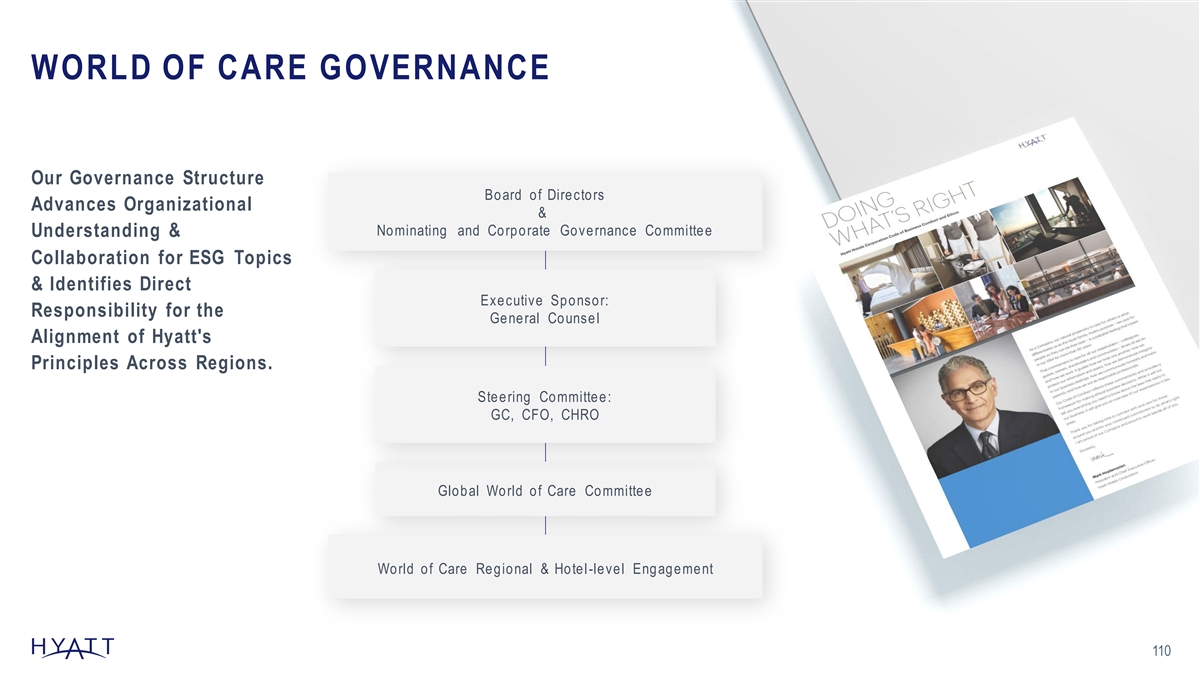 WORLD OF CARE GOVERNANCE Our Governance Structure Board of Directors Advances Organizational & Nominating and Corporate Governance Committee Understanding & Collaboration for ESG Topics & Identifies Direct Executive Sponsor: Responsibility for the General Counsel Alignment of Hyatt's Principles Across Regions. Steering Committee: GC, CFO, CHRO Global World of Care Committee World of Care Regional & Hotel-level Engagement 110