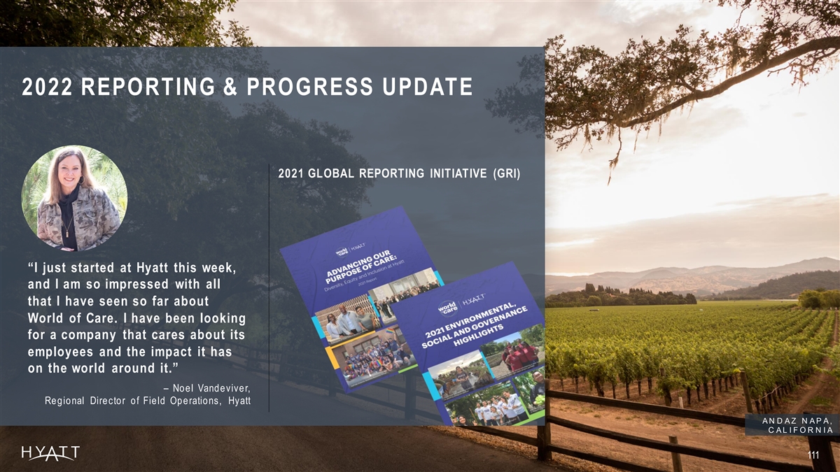 2022 REPORTING & PROGRESS UPDATE 2021 GLOBAL REPORTING INITIATIVE (GRI) “I just started at Hyatt this week, and I am so impressed with all that I have seen so far about World of Care. I have been looking for a company that cares about its employees and the impact it has on the world around it.” – Noel Vandeviver, Regional Director of Field Operations, Hyatt A N D A Z N A P A , C A L I F O R N I A 111