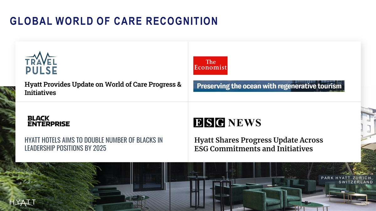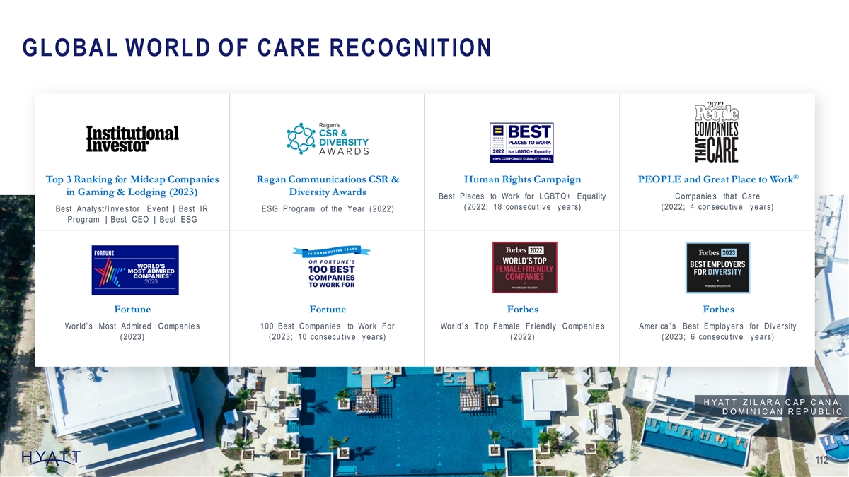 GLOBAL WORLD OF CARE RECOGNITION ® Top 3 Ranking for Midcap Companies Ragan Communications CSR & Human Rights Campaign PEOPLE and Great Place to Work in Gaming & Lodging (2023) Diversity Awards Best Places to Work for LGBTQ+ Equality Companie s that Care (2022; 18 consecu t iv e y ears) (2022; 4 consecu tiv e y ears) Best Analy st/I nv e s tor Ev ent | Best IR ESG Program of the Year (2022) Program | Best CEO | Best ESG Fortune Fortune Forbes Forbes World’ s Most Admired Companie s 100 Best Companie s to Work For World’ s T op F emale F riendly Compani e s America ’ s Best Employ er s for Div ersity (2023) (2023; 10 consecu t iv e y ears) (2022) (2023; 6 consecu tiv e y ears) H Y A T T Z I L A R A C A P C A N A , D O M I N I C A N R E P U B L I C 112