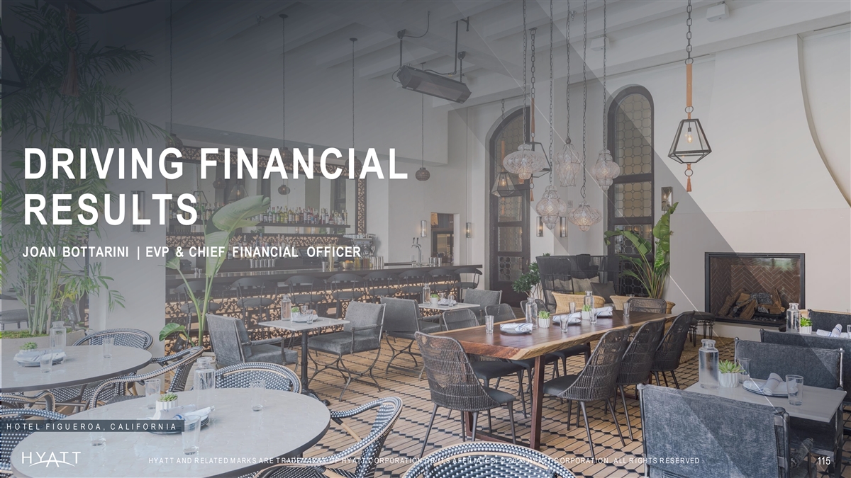DRIVING FINANCIAL RESULTS JOAN BOTTARINI | EVP & CHIEF FINANCIAL OFFICER H O T E L F I G U E R O A , C A L I F O R N I A H Y A T T A N D R ELAT E D M AR K S A R E T R AD EM AR KS O F H Y AT T C OR POR AT I ON O R I T S A F F I LI AT E S. © 2 0 23 H Y AT T C OR POR AT I O N . A LL R I GH T S R ES ER VED . 115