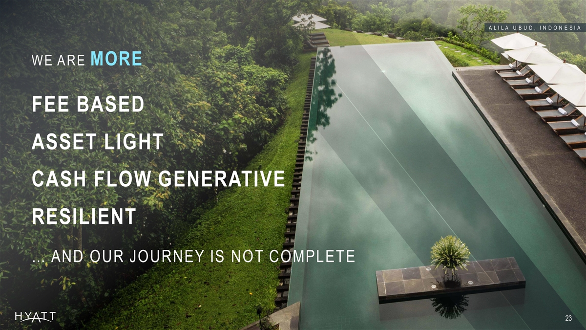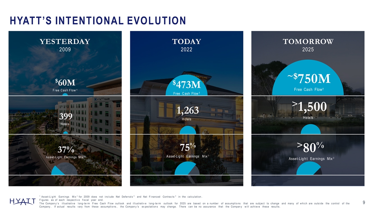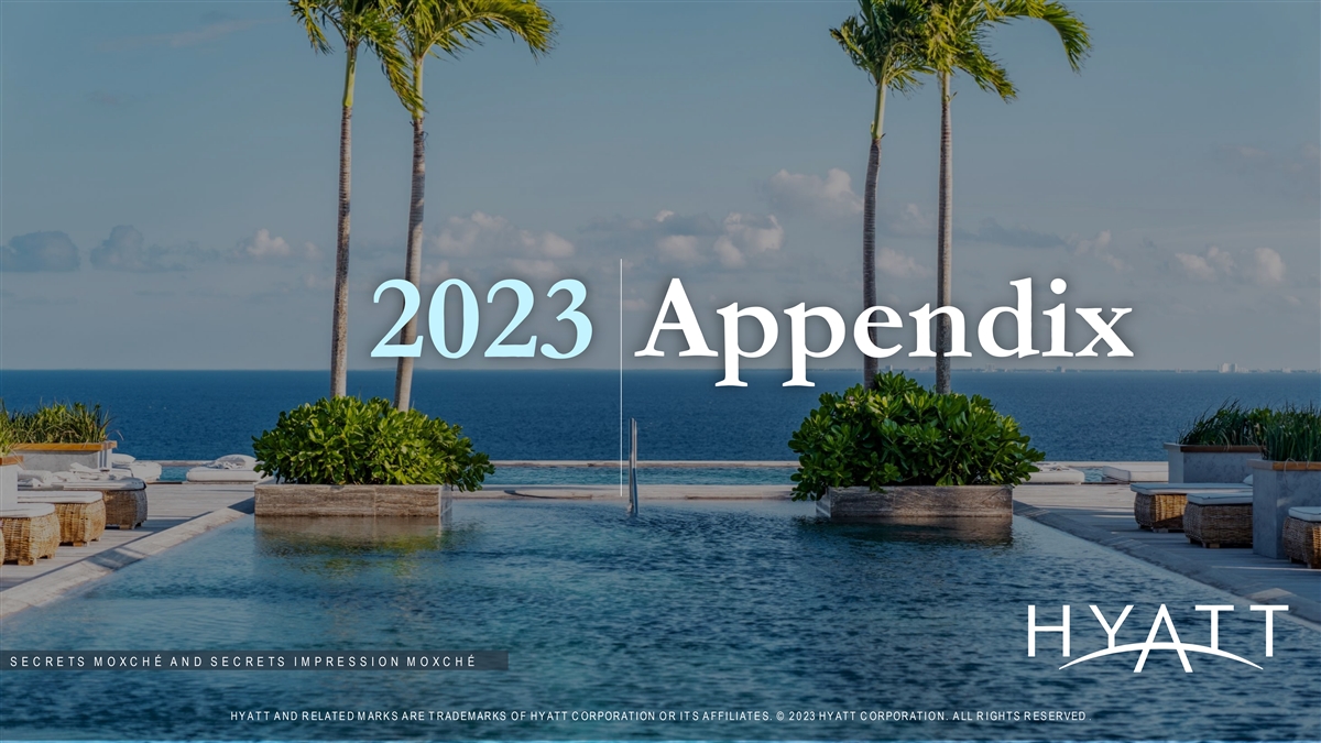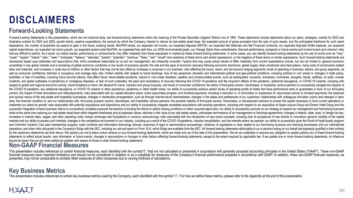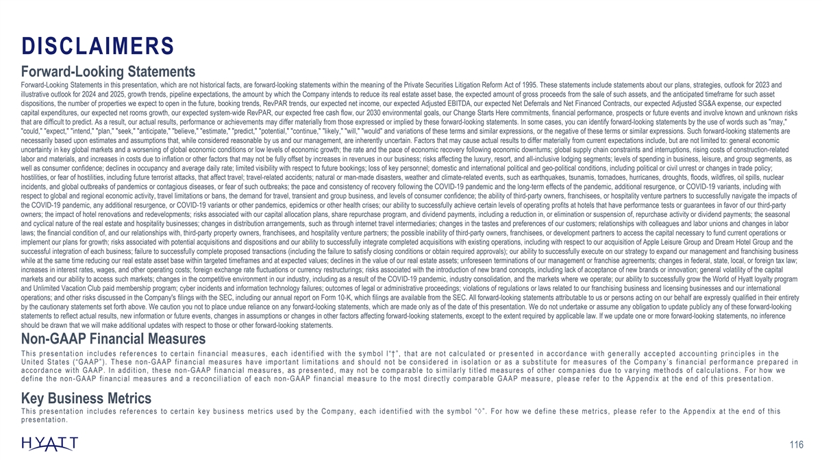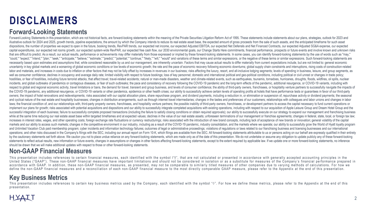 DISCLAIMERS Forward-Looking Statements Forward-Looking Statements in this presentation, which are not historical facts, are forward-looking statements within the meaning of the Private Securities Litigation Reform Act of 1995. These statements include statements about our plans, strategies, outlook for 2023 and illustrative outlook for 2024 and 2025, growth trends, pipeline expectations, the amount by which the Company intends to reduce its real estate asset base, the expected amount of gross proceeds from the sale of such assets, and the anticipated timeframe for such asset dispositions, the number of properties we expect to open in the future, booking trends, RevPAR trends, our expected net income, our expected Adjusted EBITDA, our expected Net Deferrals and Net Financed Contracts, our expected Adjusted SG&A expense, our expected capital expenditures, our expected net rooms growth, our expected system-wide RevPAR, our expected free cash flow, our 2030 environmental goals, our Change Starts Here commitments, financial performance, prospects or future events and involve known and unknown risks that are difficult to predict. As a result, our actual results, performance or achievements may differ materially from those expressed or implied by these forward-looking statements. In some cases, you can identify forward-looking statements by the use of words such as may, could, expect, intend, plan, seek, anticipate, believe, estimate, predict, potential, continue, likely, will, would and variations of these terms and similar expressions, or the negative of these terms or similar expressions. Such forward-looking statements are necessarily based upon estimates and assumptions that, while considered reasonable by us and our management, are inherently uncertain. Factors that may cause actual results to differ materially from current expectations include, but are not limited to: general economic uncertainty in key global markets and a worsening of global economic conditions or low levels of economic growth; the rate and the pace of economic recovery following economic downturns; global supply chain constraints and interruptions, rising costs of construction-related labor and materials, and increases in costs due to inflation or other factors that may not be fully offset by increases in revenues in our business; risks affecting the luxury, resort, and all-inclusive lodging segments; levels of spending in business, leisure, and group segments, as well as consumer confidence; declines in occupancy and average daily rate; limited visibility with respect to future bookings; loss of key personnel; domestic and international political and geo-political conditions, including political or civil unrest or changes in trade policy; hostilities, or fear of hostilities, including future terrorist attacks, that affect travel; travel-related accidents; natural or man-made disasters, weather and climate-related events, such as earthquakes, tsunamis, tornadoes, hurricanes, droughts, floods, wildfires, oil spills, nuclear incidents, and global outbreaks of pandemics or contagious diseases, or fear of such outbreaks; the pace and consistency of recovery following the COVID-19 pandemic and the long-term effects of the pandemic, additional resurgence, or COVID-19 variants, including with respect to global and regional economic activity, travel limitations or bans, the demand for travel, transient and group business, and levels of consumer confidence; the ability of third-party owners, franchisees, or hospitality venture partners to successfully navigate the impacts of the COVID-19 pandemic, any additional resurgence, or COVID-19 variants or other pandemics, epidemics or other health crises; our ability to successfully achieve certain levels of operating profits at hotels that have performance tests or guarantees in favor of our third-party owners; the impact of hotel renovations and redevelopments; risks associated with our capital allocation plans, share repurchase program, and dividend payments, including a reduction in, or elimination or suspension of, repurchase activity or dividend payments; the seasonal and cyclical nature of the real estate and hospitality businesses; changes in distribution arrangements, such as through internet travel intermediaries; changes in the tastes and preferences of our customers; relationships with colleagues and labor unions and changes in labor laws; the financial condition of, and our relationships with, third-party property owners, franchisees, and hospitality venture partners; the possible inability of third-party owners, franchisees, or development partners to access the capital necessary to fund current operations or implement our plans for growth; risks associated with potential acquisitions and dispositions and our ability to successfully integrate completed acquisitions with existing operations, including with respect to our acquisition of Apple Leisure Group and Dream Hotel Group and the successful integration of each business; failure to successfully complete proposed transactions (including the failure to satisfy closing conditions or obtain required approvals); our ability to successfully execute on our strategy to expand our management and franchising business while at the same time reducing our real estate asset base within targeted timeframes and at expected values; declines in the value of our real estate assets; unforeseen terminations of our management or franchise agreements; changes in federal, state, local, or foreign tax law; increases in interest rates, wages, and other operating costs; foreign exchange rate fluctuations or currency restructurings; risks associated with the introduction of new brand concepts, including lack of acceptance of new brands or innovation; general volatility of the capital markets and our ability to access such markets; changes in the competitive environment in our industry, including as a result of the COVID-19 pandemic, industry con