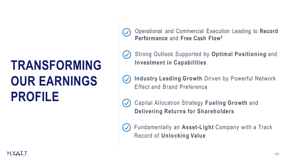 Operational and Commercial Execution Leading to Record † Performance and Free Cash Flow Strong Outlook Supported by Optimal Positioning and Investment in Capabilities TRANSFORMING Industry Leading Growth Driven by Powerful Network OUR EARNINGS Effect and Brand Preference PROFILE Capital Allocation Strategy Fueling Growth and Delivering Returns for Shareholders Fundamentally an Asset-Light Company with a Track Record of Unlocking Value 117