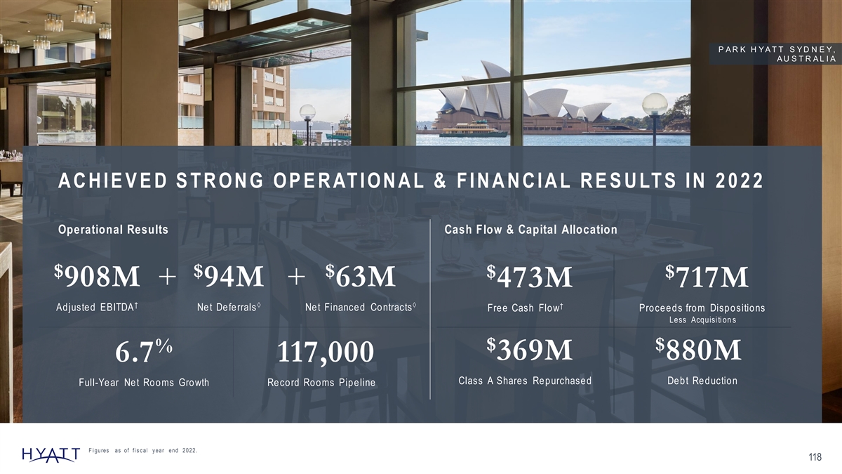 P A R K H Y A T T S Y D N E Y , A U S T R A L I A A C H IE V E D S T R ON G OP E R AT I ON A L & F IN A N C IA L R E S U LT S IN 2 0 2 2 Operational Results Cash Flow & Capital Allocation $ $ $ $ $ 908M + 94M + 63M 473M 717M †àà † Adjusted EBITDA Net Deferrals Net Financed Contracts Free Cash Flow Proceeds from Dispositions Less Acquisi ti on s $ $ % 369M 880M 6.7 117,000 Class A Shares Repurchased Debt Reduction Full-Year Net Rooms Growth Record Rooms Pipeline F i gures as of fi s c al y ear end 2022. 118