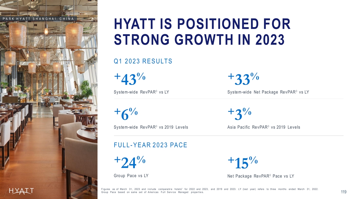 P A R K H Y A T T S H A N G H A I , C H I N A HYATT IS POSITIONED FOR STRONG GROWTH IN 2023 Q1 2 0 2 3 RE S ULT S + % + % 43 33 àà System-wide RevPAR vs LY System-wide Net Package RevPAR vs LY + % + % 6 3 àà System-wide RevPAR vs 2019 Levels Asia Pacific RevPAR vs 2019 Levels F UL L - Y E A R 2 0 2 3 PA CE + % + % 24 15 à Group Pace vs LY Net Package RevPAR Pace vs LY à F i gures as of Marc h 31, 2023 and i nc l ude c ompara bl e hotel s for 2022 and 2023, and 2019 and 2023. LY (l as t y ear) refers to three months ended Marc h 31, 2022. G roup P ac e bas ed on s ame s et of A meri c as F ul l S erv i c e Managed proper ti e s . 119 .
