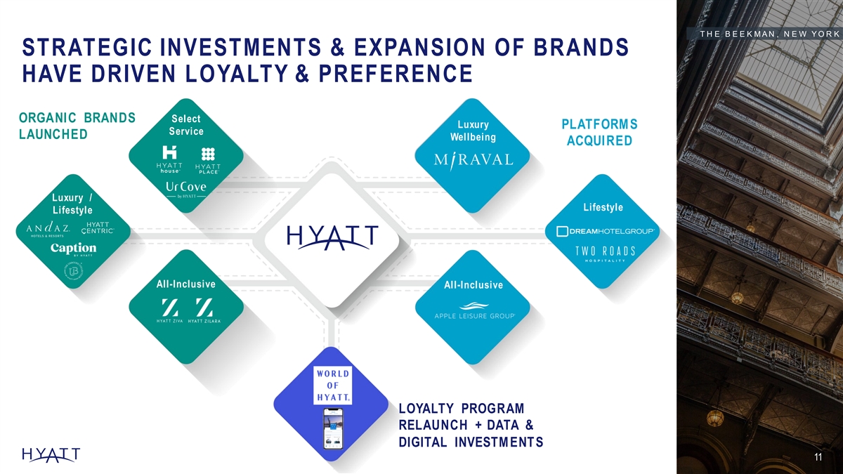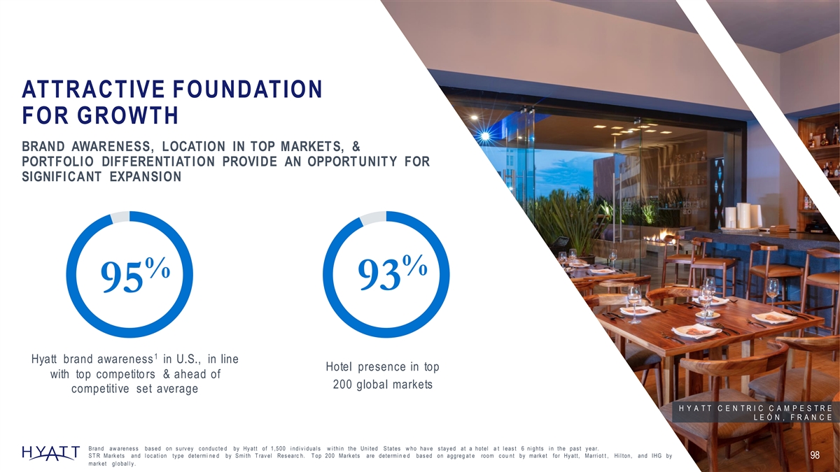 ATTRACTIVE FOUNDATION FOR GROWTH BRAND AWARENESS, LOCATION IN TOP MARKET S, & PORTFOLIO DIFFERENTIAT ION PROVIDE AN OPPORT UNIT Y FOR SIGNIFICANT EXPANSION % % 93 95 1 Hyatt brand awareness in U.S., in line Hotel presence in top with top competito rs & ahead of 200 global markets competitive set average H Y A T T C E N T R I C C A M P E S T R E L E Ó N , F R A N C E B rand aw arenes s bas ed on s urv ey c onduc te d by Hy att of 1,500 i ndi v i dual s w i thi n the Uni ted S tates w ho hav e s tay ed at a hotel a t l eas t 6 ni ghts i n the pas t y ear. S T R Mark ets and l oc ati on ty pe determi ne d by S mi th T rav el Res earc h. T op 200 Mark ets are determi n e d bas ed on aggreg at e room c ou nt by mark et for Hy att, Marri ot t , Hi l ton, and IHG by 98 mark et gl obal l y .