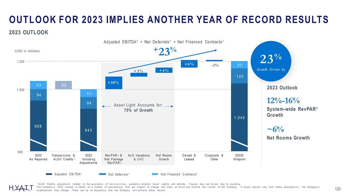 OUTLOOK FOR 2023 IMPLIES ANOTHER YEAR OF RECORD RESULTS 2023 OUTLOOK †àà Adjusted EBITDA + Net Deferrals + Net Financed Contracts + % (U S D in millions ) 23 % 1,225 23 +6% 60 -1% Growth Driv en by +4% +3% 120 +10% 63 65 2023 Outlook 1,000 63 94 12%-16% 94 Asset Light Accounts for: à System-wide RevPAR 75% of Growth Growth 1 ,0 4 5 908 843 ~6% Net Rooms Growth 500 2022 Transa c ti o ns & 2022 Rev P A R à & A LG V acatio n s N et Rooms Ow ned & C orpora te & 2023E 1 A s Reporte d A LGV C redits Includi n g N et P ackage & U V C Grow th Leased Other M idpoin t à A djustm e n ts Rev P A R † àà SAer dijes us1te d E B ITDA Series2 Series3 Series4 N et Deferr a ls N et Finance d C ontrac ts 1 A LG V Credi ts adj us tme nt rel ated to the ex pi rati o n of non -re c u r ri n g , pandemi c - re l a t e d trav el c redi ts and refunds . F i gures may no t ti e-out due to roundi n g . T he Compan y ’ s 2023 outl ook i s bas ed on a number of as s umpti o ns that are s ubj ec t to c hange and many of w hi c h are outs i de the c ontrol of the Company . If ac tual res ul ts v ary from thes e as s umpti o n s , the Company 's 120 ex pec tati o ns may c hange. T here c an be no as s uranc e that the Company w i l l ac hi ev e thes e res ul ts .
