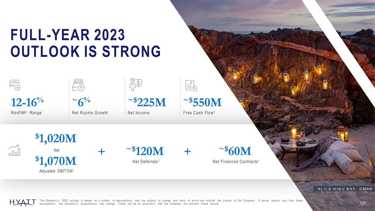 FULL-YEAR 2023 OUTLOOK IS STRONG % ~ % ~$ ~$ 12-16 6 225M 550M à † RevPAR Range Net Room s Growth Net Inc om e Free Cash Flow $ 1,020M ~$ ~$ to + 120M + 60M $ àà Net Deferrals Net Financ ed Contrac ts 1,070M † Adjusted EBIT DA A L I L A H I N U B A Y , O M A N T he Compan y ’ s 2023 outl ook i s bas ed on a number of as s umpti o ns that are s ubj ec t to c hange and many of w hi c h are outs i de the c ontrol of the Company . If ac tual res ul ts v ary from thes e as s umpti o ns , the Company 's ex pec tati o ns may c hange. T here c an be no as s uranc e that the Company w i l l ac hi ev e thes e res ul ts . 121