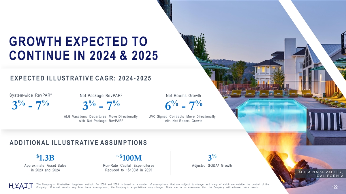 GROWTH EXPECTED TO CONTINUE IN 2024 & 2025 E X P E CT E D IL L U S T R AT IV E CAGR: 2 0 2 4 -2025 à à System-wide RevPAR Net Package RevPAR Net Rooms Growth % % % % % % 3 - 7 3 - 7 6 - 7 ALG Vacation s Departures Mov e Directiona l ly UVC Signed Contracts Mov e Directiona l ly à with Net Package Rev PAR with Net Rooms Growth A D D IT ION A L IL L U S T R AT IV E A S S U MP T ION S $ ~$ % 1.3B 100M 3 † Approximate Asset Sales Run-Rate Capital Expenditur es Adjusted SG&A Growth in 2023 and 2024 Reduced to ~$100M in 2025 A L I L A N A P A V A L L E Y , C A L I F O R N I A T he Compan y 's i l l us trati v e l ong -te r m outl ook for 2024 and 2025 i s bas ed on a number of as s umpti o ns that are s ubj ec t to c hange an d many of w hi c h are outs i de the c ontrol of the Company . If ac tual res ul ts v ary from thes e as s umpti o ns , the Compan y 's ex pec tati on s may c hange. T here c an be no as s uranc e that the Compan y w i l l ac hi ev e thes e res ul ts . 122