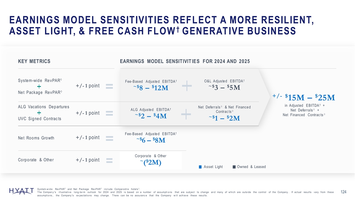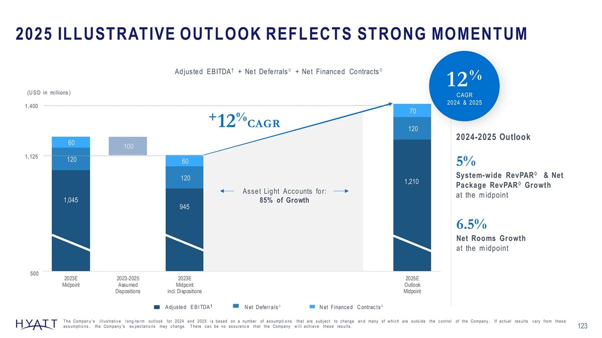 2025 ILLUSTRATIVE OUTLOOK REFLECTS STRONG MOMENTUM †àà Adjusted EBITDA + Net Deferrals + Net Financed Contracts % 12 (U S D in millions ) CAGR 2024 & 2025 - - 1,400 70 + % 12 CAGR 120 2024-2025 Outlook 60 100 1,125 120 60 5% à System-wide RevPAR & Net 120 1,210 à Package RevPAR Growth Asset Light Accounts for: at the m idpoint 1,045 85% of Growth 945 6.5% Net Rooms Growth at the m idpoint 500 2023E 2023-2025 2023E 2025E Midpoint Assumed Midpoint Outlook Dispositions incl. Dispositions Midpoint †àà A djuste d E B ITDA N et Deferr a ls N et Finance d C ontrac ts T he Compan y 's i l l us trati v e l ong -te r m outl ook for 2024 and 2025 i s bas ed on a number of as s umpti o ns that are s ubj ec t to c hange an d many of w hi c h are outs i de the c ontrol of the Company . If ac tual res ul ts v ary from thes e as s umpti o ns , the Company 's ex pec tati o ns may c hange. T here c an be no as s uranc e that the Company w i l l ac hi ev e thes e res ul ts . 123