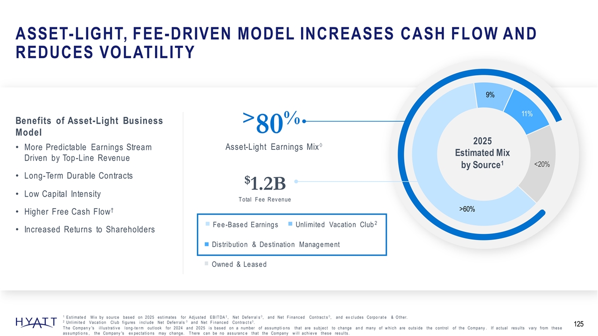 EARNINGS MODEL SENSITIVITIES REFLECT A MORE RESILIENT, † ASSET LIGHT, & FREE CASH FLOW GENERATIVE BUSINESS KEY METRICS EARNINGS MODEL SENSITIVIT IES FOR 2024 AND 2025 à † † System-wide RevPAR O&L Adjusted EBITDA Fee-Based Adjusted EBITDA +/- 1 point ~$ $ ~$ $ 3 – 5M 8 – 12M à Net Package RevPAR +/- $ $ 15M – 25M † in Adjusted EBITDA + à ALG Vacations Departures Net Deferrals & Net Financed † à ALG Adjusted EBITDA à Net Deferra ls + Contrac ts +/- 1 point à ~$ $ Net Financed Contrac ts 2 – 4M ~$ $ UVC Signed Contrac ts 1 – 2M † Fee-Based Adjuste d EBITDA Net Rooms Growth +/- 1 point ~$ $ 6 – 8M Corporate & Other Corporate & Other +/- 1 point ~ $ ( 2M) Asset Light Owned & Leased ààà S y s tem-w i d e Rev P A R and Net P ac k age Rev P A R i nc l ude Compar a bl e hotel s . T he Compan y 's i l l us trati v e l ong -te r m outl ook for 2024 and 2025 i s bas ed on a number of as s umpti o ns that are s ubj ec t to c hange an d many of w hi c h are outs i de the c ontrol of the Company . If ac tual res ul ts v ary from thes e 124 as s umpti o ns , the Company 's ex pec tati o ns may c hange. T here c an be no as s uranc e that the Company w i l l ac hi ev e thes e res ul ts .