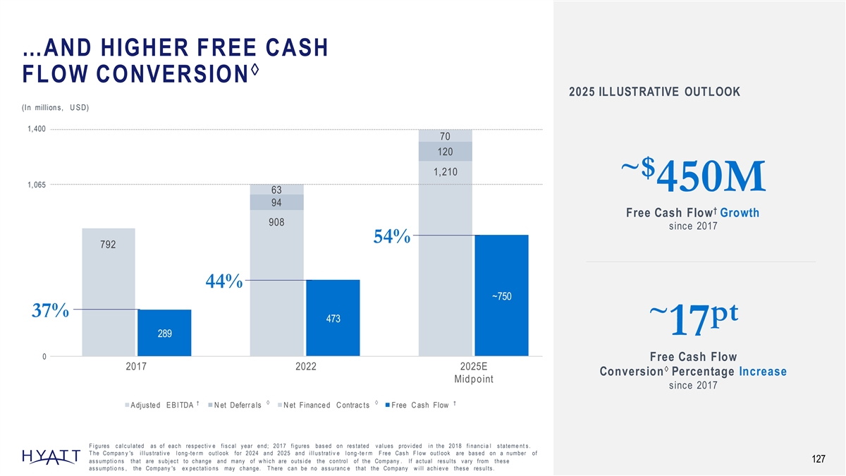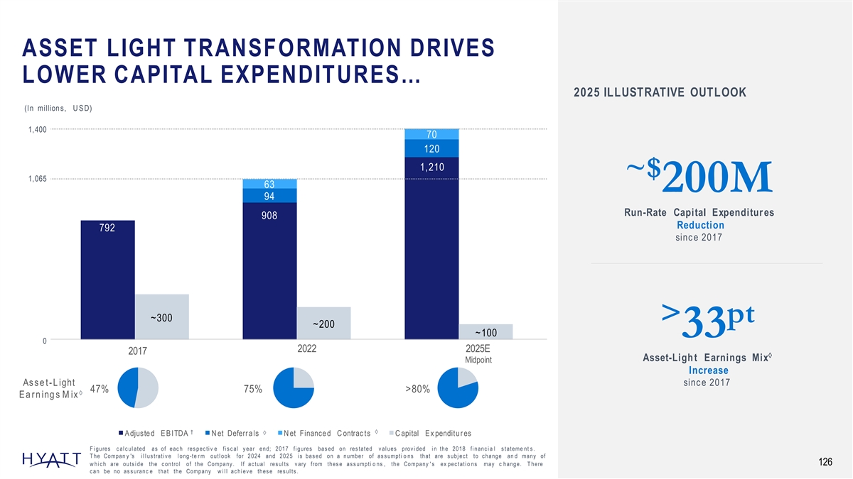 ASSET LIGHT TRANSFORMATION DRIVES LOWER CAPITAL EXPENDITURES… 2025 ILLUSTRATIVE OUTLOOK (In million s, U S D) 1,400 70 120 1,210 ~$ 1,065 63 200M 94 Run-Rate Capital Expenditur es 908 Reduction 792 sinc e 2017 ~300 > pt ~200 ~100 33 0 2022 2025E 2017 à Asset-Ligh t Earnings Mix Midpoint Increase As s e t- L ight sinc e 2017 47% 75% >80% à E a r n ing s M ix †à à A djuste d E B ITDA N et Deferr a ls N et Finance d C ontrac ts C apital E x penditu r es F i gures c al c ul ated as of eac h res pec ti v e fi s c al y ear end; 2017 fi gures bas ed on res tated v al ues prov i ded i n the 2018 fi nanc i a l s tateme nt s . T he Compan y 's i l l us trati v e l ong -te r m outl ook for 2024 and 2025 i s bas ed on a number of as s umpti o ns that are s ubj ec t to c hange an d many of 126 w hi c h are outs i de the c ontrol of the Company . If ac tual res ul ts v ary from thes e as s umpti o ns , the Company ' s ex pec tati o ns may c hange. T here c an be no as s uranc e that the Company w i l l ac hi ev e thes e res ul ts .