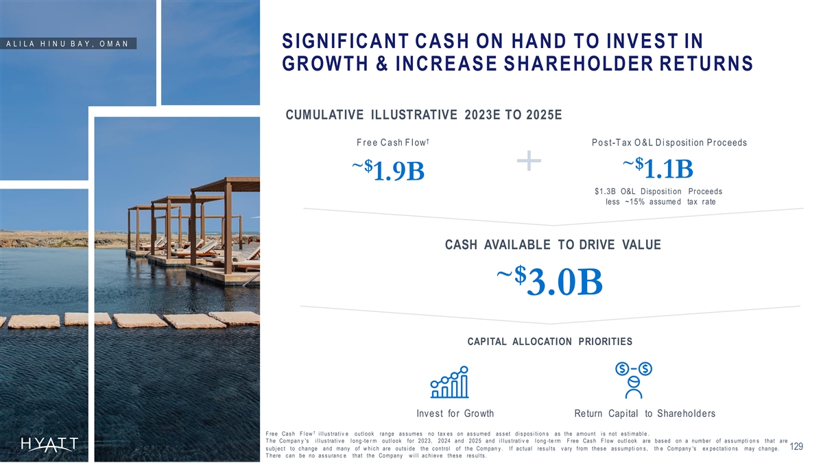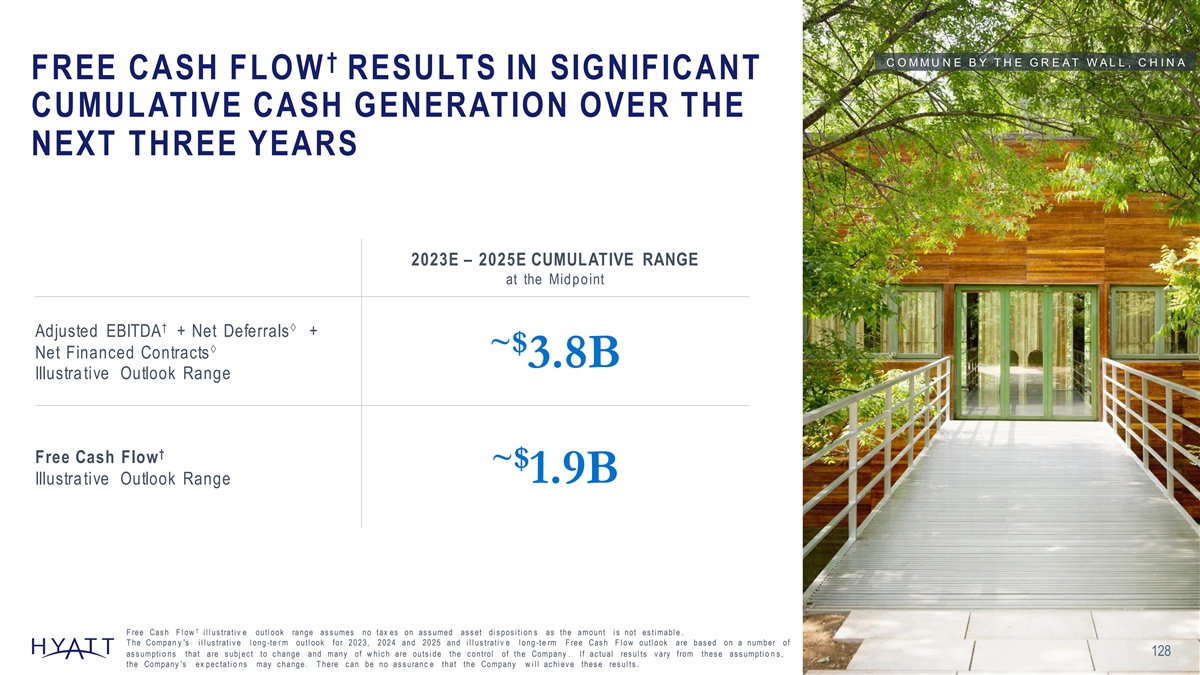 C O M M U N E B Y T H E G R E A T W A L L , C H I N A † FREE CASH FLOW RESULTS IN SIGNIFICANT CUMULATIVE CASH GENERATION OVER THE NEXT THREE YEARS 2023E – 2025E CUMULATIVE RANGE at the Midpoint †à Adjusted EBITDA + Net Deferrals + à ~$ Net Financed Contracts 3.8B Illustra tive Outlook Range † Free Cash Flow ~$ 1.9B Illustra tive Outlook Range † F ree Cas h F l ow i l l us trati v e outl ook range as s umes no tax es on as s umed as s et di s pos i ti on s as the amount i s not es ti mabl e . T he Compan y 's i l l us trati v e l ong -te r m outl ook for 2023, 2024 and 2025 and i l l us trati v e l ong -te rm F ree Cas h F l ow outl ook are bas ed on a number of 128 as s umpti o ns that are s ubj ec t to c hange and many of w hi c h are outs i de the c ontrol of the Company . If ac tual res ul ts v ary from thes e as s umpti o n s , the Company 's ex pec tati o ns may c hange. T here c an be no as s uranc e that the Company w i l l ac hi ev e thes e res ul ts .