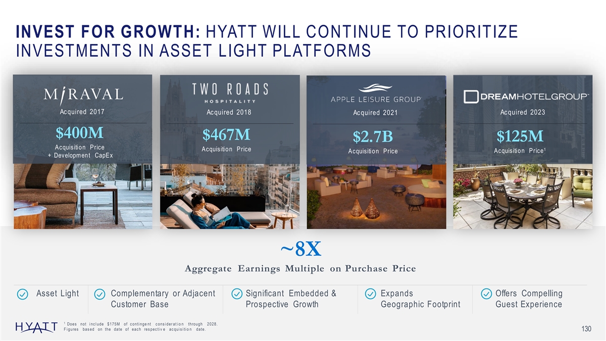 INVEST FOR GROWTH: HYATT WILL CONTINUE TO PRIORITIZE INVESTMENTS IN ASSET LIGHT PLATFORMS Ac quired 2017 Ac quired 2018 Ac quired 2021 Ac quired 2023 $400M $467M $125M $2.7B Acquisition Price 1 Acquisition Price Acquisition Price Acquisitio n Price + Developmen t CapEx ~8X Aggregate Earnings Multiple on Purchase Price Asset Light Complementary or Adjacent Significant Embedded & Expands Offers Compelling Customer Base Prospective Growth Geographic Footprint Guest Experience 1 Does not i nc l ude $175M of c onti nge nt c ons i der at i o n through 2028. F i gures bas ed on the date of eac h res pec ti v e ac qui s i ti o n date. 130