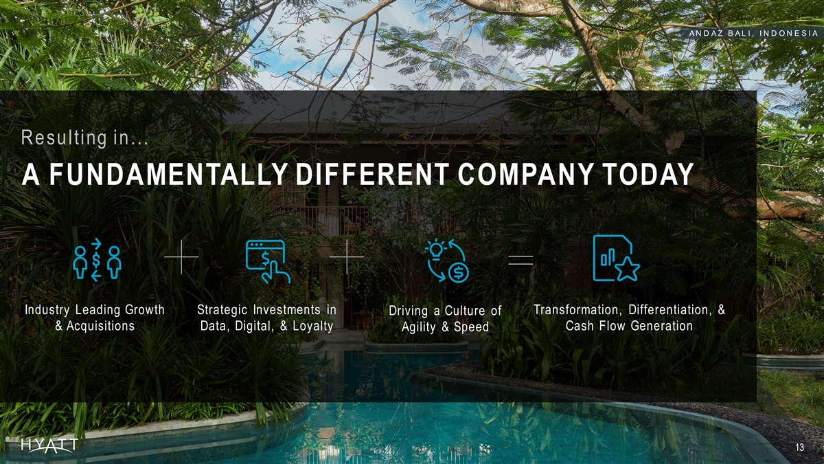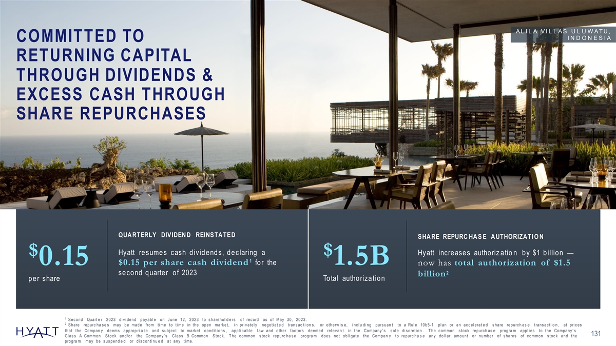 A L I L A V I L L A S U L U W A TU , I N D O N E S I A COMMITTED TO RETURNING CAPITAL THROUGH DIVIDENDS & EXCESS CASH THROUGH SHARE REPURCHASES QUA RTERLY DIVIDEN D REINSTA TED SHA RE REPURC HA S E A UTHORIZA TI O N Hyatt resumes cash dividends, declaring a $ Hyatt increases authoriz atio n by $1 billion — $ 1 0.15 $0.15 per share cash dividend for the 1.5B now has total authorization of $1.5 2 second quarter of 2023 billion Total authorization per share 1 S ec ond Quart e r 2023 di v i dend pay abl e on J une 12, 2023 to s harehol d e rs of rec ord as of May 30, 2023. 2 S hare repurc ha s e s may be made from ti me to ti me i n the open mark et, i n pri v atel y negoti at e d trans ac ti on s , or otherw i s e, i nc l u di ng purs uan t to a Rul e 10b5-1 pl an or an ac c el erat e d s hare repurc h as e trans ac ti o n , at pri c es that the Compan y deems approp ri a t e and s ubj ec t to mark et c ondi ti ons , appl i c abl e l aw and other fac tors deemed rel ev an t i n the Company ’ s s ol e di s c reti on . T he c ommon s toc k repurc h as e progra m appl i es to the Company ’ s 131 Cl as s A Common S toc k and/or the Company ’ s Cl as s B Common S toc k . T he c ommon s toc k repurc ha s e progra m does not obl i gate the Compan y to repurc ha s e any dol l ar amount or number of s hares of c ommon s toc k and the progra m may be s us pend e d or di s c onti nu e d at any ti me.
