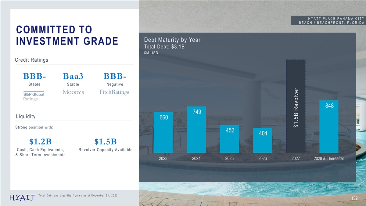 H Y A T T P L A C E P A N A M A C I T Y B E A C H / B E A C H F R O N T , F L O R I D A COMMITTED TO Debt Maturity by Year INVESTMENT GRADE Total Debt: $3.1B $M USD Credit Ratings BBB- Baa3 BBB- Stable Stable Negative 848 749 Liquidity 660 Strong position with: 452 404 $1.2B $1.5B Cash, Cash Equivalents, Revolver Capacity Available & Short-Term Investments 2023 2024 2025 2026 2027 2028 & Thereafter Total Debt and Liquidity figures as of December 31, 2022. 132 $1.5B Revolver