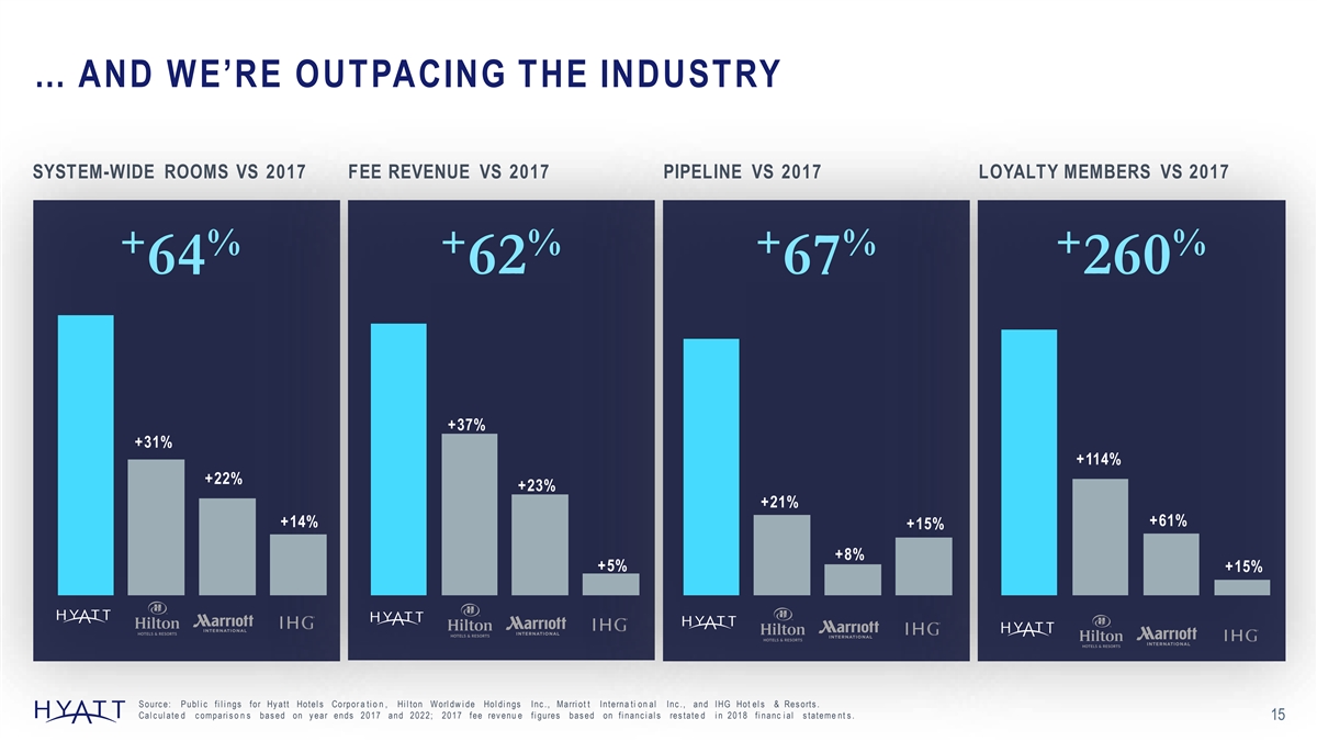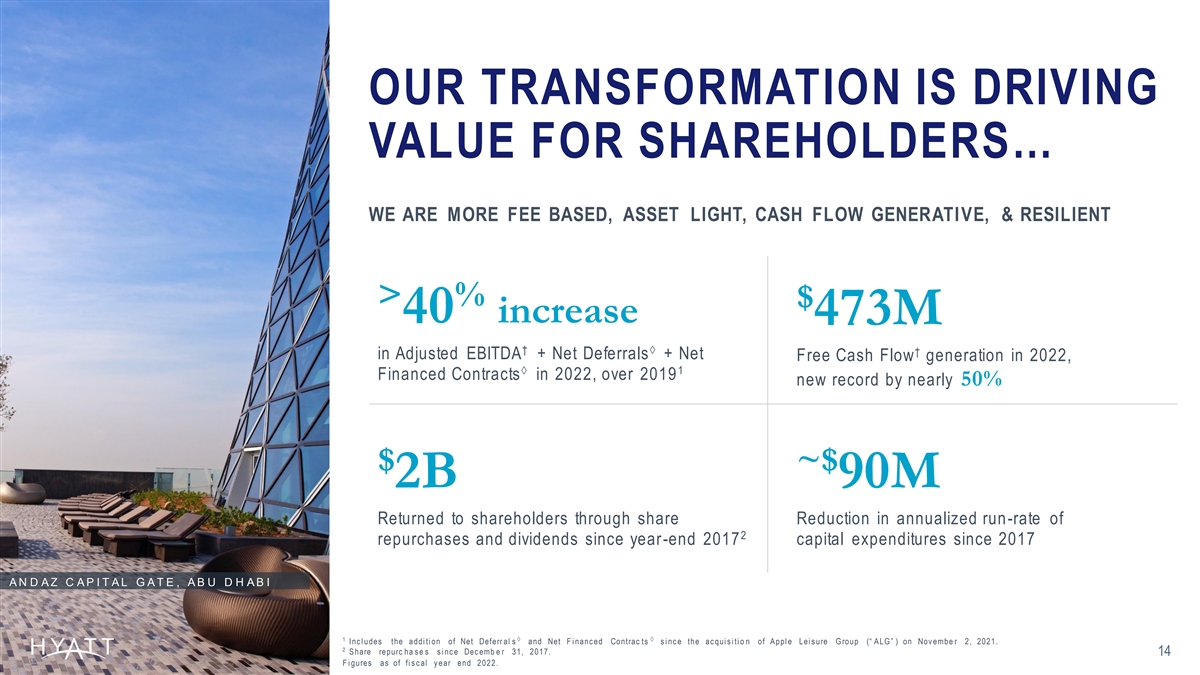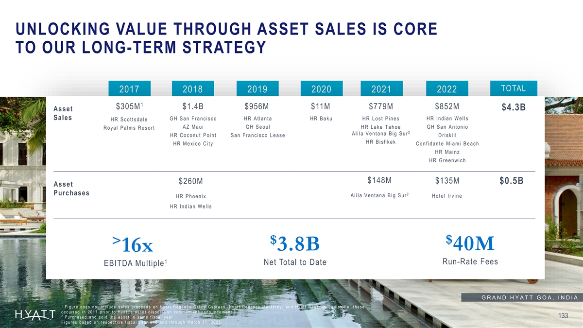 UNLOCKING VALUE THROUGH ASSET SALES IS CORE TO OUR LONG-TERM STRATEGY TOTAL 2017 2018 2019 2020 2021 2022 1 $305M $1.4B $956M $11M $779M $852M $4.3B Asset Sales GH San Francisco HR Atlanta HR Baku HR Lost Pines HR Indian Wells HR Scottsdale AZ Maui GH Seoul HR Lake Tahoe GH San Antonio Royal Palms Resort 2 A lila Ventana Big Sur HR Coconut Point San Francisco Lease D ris k ill HR Bishkek HR Mexico City Confidante Miami Beach HR Mainz HR Greenwich $148M $135M $260M $0.5B Asset Purchases 2 A lila Ventana Big Sur HR Phoenix Hotel Irvine HR Indian Wells $ $ > 40M 3.8B 16x 1 Run-Rate Fees Net Total to Date EBITDA Multiple GRAND HYATT GOA, INDIA 1 Figure does not include sales proceeds on Hyatt Regency Grand Cypress, Hyatt Regency Monterey, and Hyatt Regency Louisville; th es e occurred in 2017 prior to Hyatt’s asset disposition commitment announcement. 2 133 P ur c has e d and sold the asset in same fiscal y ear . Figures based on respective fiscal year end and through March 31, 2023.