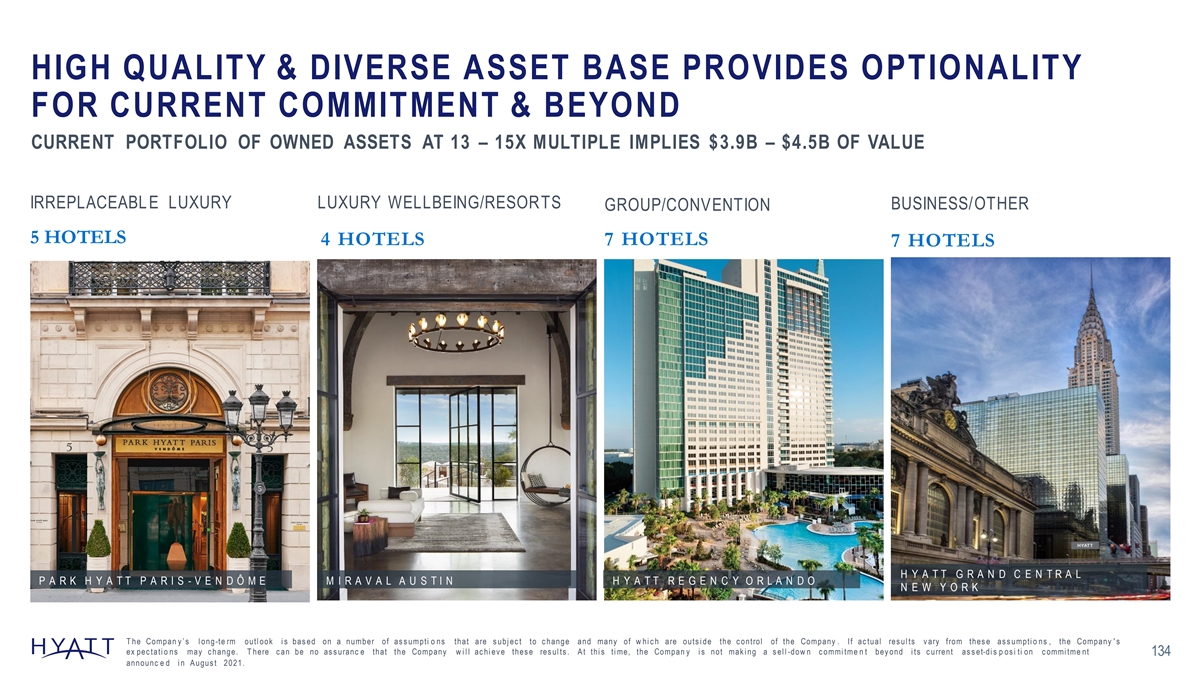 HIGH QUALITY & DIVERSE ASSET BASE PROVIDES OPTIONALITY FOR CURRENT COMMITMENT & BEYOND CURRENT PORTFOLIO OF OWNED ASSETS AT 13 – 15X MULTIPLE IMPLIES $3.9B – $4.5B OF VALUE IRREPLACEABL E LUXURY LUXURY WELLBEING/RESORTS BUSINESS/OTHER GROUP/CONVENTION 5 HOTELS 4 HOTELS 7 HOTELS 7 HOTELS H Y A T T G R A N D C E N T R A L P A R K H Y A T T P A R I S - V E N D Ô M E M I R A V A L A U S T I N H Y A T T R E G E N C Y O R L A N D O N E W Y O R K T he Compan y ’ s l ong -te rm outl ook i s bas ed on a number of as s umpti o ns that are s ubj ec t to c hange and many of w hi c h are outs i de the c ontrol of the Company . If ac tual res ul ts v ary from thes e as s umpti o ns , the Company ' s ex pec tati o ns may c hange. T here c an be no as s uranc e that the Company w i l l ac hi ev e thes e res ul ts . A t thi s ti me, the Compan y i s not mak i ng a s el l -dow n c ommi tme n t bey ond i ts c urrent as s et-di s p os i ti on c ommi tme nt 134 announc e d i n A ugus t 2021.