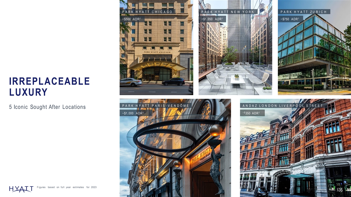P A R K H Y A T T C H I C A G O P A R K H Y A T T N E W Y O R K P A R K H Y A T T Z U R I C H ààà ~$500 A DR ~$1,050 A DR ~$750 A DR IRREPLACEABLE LUXURY P A R K H Y A T T P A R I S - V E N D Ô M E A N D A Z L O N D O N L I V E R P O O L S T R E E T 5 Iconic Sought After Locations à ~$à ~$1,000 A DR 350 A DR F i gures bas ed on ful l y ear es ti mates for 2023 135