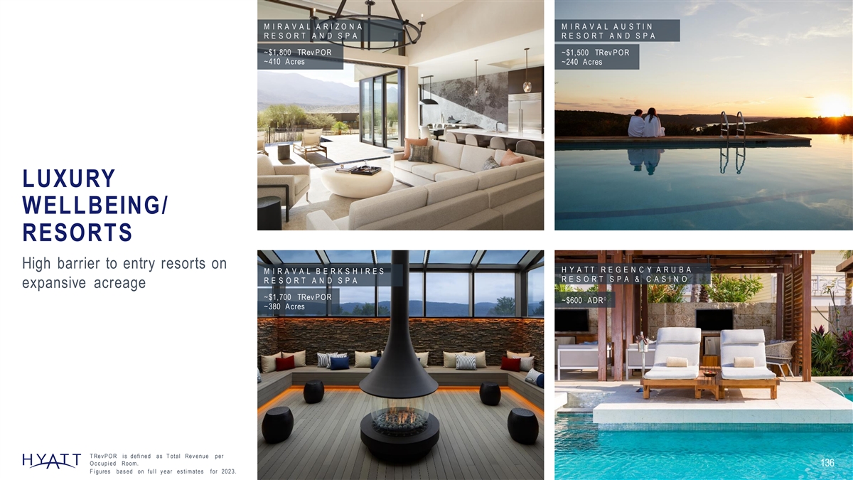M I R A V A L A R I Z O N A M I R A V A L A U S T I N R E S O R T A N D S P A R E S O R T A N D S P A ~$1,800 TRev P OR ~$1,500 TRev P OR ~410 A cres ~240 A cres LUXURY WELLBEING/ RESORTS High barrier to entry resorts on H Y A T T R E G E N C Y A R U B A M I R A V A L B E R K S H I R E S R E S O R T S P A & C A S I N O R E S O R T A N D S P A expansive acreage ~$1,700 TRev P ORà ~$600 A DR ~380 A cres T Rev P O R i s defi ned as T otal Rev enue per O c c upi ed Room. 136 F i gures bas ed on ful l y ear es ti mates for 2023.