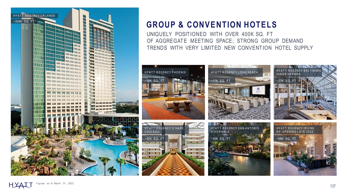 H Y A T T R EG EN C Y O R LA N DO ~204K S Q. FT GROUP & CONVENTION HOTELS UNIQUELY POSIT IONED WITH OVER 400K SQ. FT OF AGGREGAT E MEETING SPACE; STRONG GROUP DEMAND TRENDS WITH VERY LIMITED NEW CONVENT ION HOTEL SUPPLY H Y A T T R EG EN C Y B A L T I M OR E H Y A T T R EG EN C Y P H O E N I X H Y A T T R EG EN C Y L O N G B E AC H I N N E R H A R BO R ~36K S Q. FT ~17K S Q. FT ~27K S Q. FT H Y A T T R EG EN C Y O ’ H A R E H Y A T T R EG EN C Y S A N A N T ON I O H Y A T T R EG EN C Y I R V I N E C H I C A G O R I V E R W AL K RE - O P EN I N G L A T E 2 0 23 ~92K S Q. FT ~30K S Q. FT ~56K S Q. FT F i gures as of Marc h 31, 2023. 137