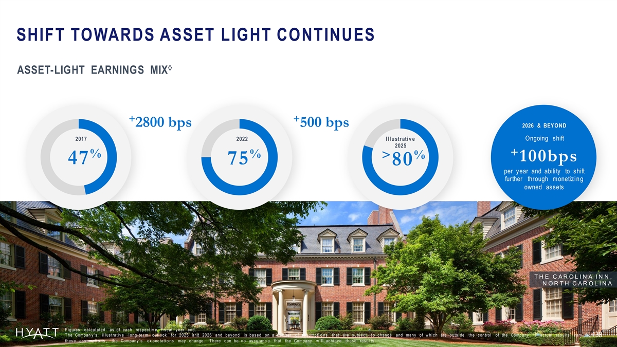SHIFT TOWARDS ASSET LIGHT CONTINUES à ASSET-LIGHT EARNINGS MIX + + 2800 bps 500 bps 2026 & BEY OND 2017 2022 Illustrativ e Ongoing shift 2025 + % % > % 100bps 47 75 80 per year and ability to shift further through monetizing owned assets T H E C A R O L I N A I N N , N O R T H C A R O L I N A F i gures c al c ul ated as of eac h res pec ti v e fi s c al y ear end. T he Compan y 's i l l us trati v e l ong -te r m outl ook for 2025 and 2026 and bey ond i s bas ed on a number of as s umpti o ns that are s ubj ec t t o c hange and many of w hi c h are outs i de the c ontrol of the Company . If ac tual res ul ts v ary from 138 138 thes e as s umpti o ns , the Company 's ex pec tati o ns may c hange. T here c an be no as s uranc e that the Company w i l l ac hi ev e thes e res ul ts .