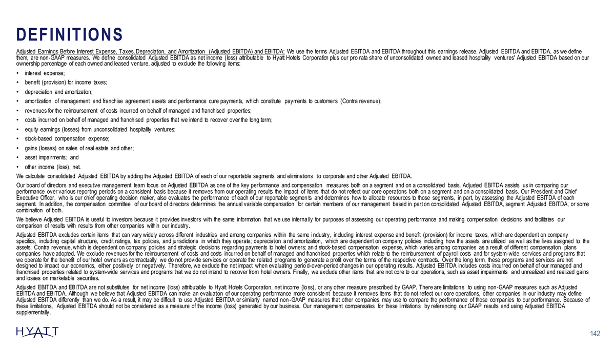 DEFINITIONS Adjusted Earnings Before Interest Expense, Taxes, Depreciation, and Amortization (Adjusted EBITDA) and EBITDA: We use the terms Adjusted EBITDA and EBITDA throughout this earnings release. Adjusted EBITDA and EBITDA, as we define them, are non-GAAP measures. We define consolidated Adjusted EBITDA as net income (loss) attributable to Hyatt Hotels Corporation plus our pro rata share of unconsolidated owned and leased hospitality ventures' Adjusted EBITDA based on our ownership percentage of each owned and leased venture, adjusted to exclude the following items: • interest expense; • benefit (provision) for income taxes; • depreciation and amortization; • amortization of management and franchise agreement assets and performance cure payments, which constitute payments to customers (Contra revenue); • revenues for the reimbursement of costs incurred on behalf of managed and franchised properties; • costs incurred on behalf of managed and franchised properties that we intend to recover over the long term; • equity earnings (losses) from unconsolidated hospitality ventures; • stock-based compensation expense; • gains (losses) on sales of real estate and other; • asset impairments; and • other income (loss), net. We calculate consolidated Adjusted EBITDA by adding the Adjusted EBITDA of each of our reportable segments and eliminations to corporate and other Adjusted EBITDA. Our board of directors and executive management team focus on Adjusted EBITDA as one of the key performance and compensation measures both on a segment and on a consolidated basis. Adjusted EBITDA assists us in comparing our performance over various reporting periods on a consistent basis because it removes from our operating results the impact of items that do not reflect our core operations both on a segment and on a consolidated basis. Our President and Chief Executive Officer, who is our chief operating decision maker, also evaluates the performance of each of our reportable segmen ts and determines how to allocate resources to those segments, in part, by assessing the Adjusted EBITDA of each segment. In addition, the compensation committee of our board of directors determines the annual variable compensation for certain members of our management based in part on consolidated Adjusted EBITDA, segment Adjusted EBITDA, or some combination of both. We believe Adjusted EBITDA is useful to investors because it provides investors with the same information that we use interna lly for purposes of assessing our operating performance and making compensation decisions and facilitates our comparison of results with results from other companies within our industry. Adjusted EBITDA excludes certain items that can vary widely across different industries and among companies within the same industry, including interest expense and benefit (provision) for income taxes, which are dependent on company specifics, including capital structure, credit ratings, tax policies, and jurisdictions in which they operate; depreciation a nd amortization, which are dependent on company policies including how the assets are utilized as well as the lives assigned to the assets; Contra revenue, which is dependent on company policies and strategic decisions regarding payments to hotel owners; an d stock-based compensation expense, which varies among companies as a result of different compensation plans companies have adopted. We exclude revenues for the reimbursement of costs and costs incurred on behalf of managed and franch ised properties which relate to the reimbursement of payroll costs and for system-wide services and programs that we operate for the benefit of our hotel owners as contractually we do not provide services or operate the related programs to generate a profit over the terms of the respective contracts. Over the long term, these programs and services are not designed to impact our economics, either positively or negatively. Therefore, we exclude the net impact when evaluating perio d-over-period changes in our operating results. Adjusted EBITDA includes costs incurred on behalf of our managed and franchised properties related to system-wide services and programs that we do not intend to recover from hotel owners. Finally, we exclude other items that are not core to our operations, such as asset impairments and unrealized and realized gains and losses on marketable securities. Adjusted EBITDA and EBITDA are not substitutes for net income (loss) attributable to Hyatt Hotels Corporation, net income (loss), or any other measure prescribed by GAAP. There are limitations to using non-GAAP measures such as Adjusted EBITDA and EBITDA. Although we believe that Adjusted EBITDA can make an evaluation of our operating performance more consiste nt because it removes items that do not reflect our core operations, other companies in our industry may define Adjusted EBITDA differently than we do. As a result, it may be difficult to use Adjusted EBITDA or similarly named non -GAAP measures that other companies may use to compare the performance of those companies to our performance. Because of these limitations, Adjusted EBITDA should not be considered as a measure of the income (loss) generated by our business. Our management compensates for these limitations by referencing our GAAP results and using Adjusted EBITDA supplementally. 142