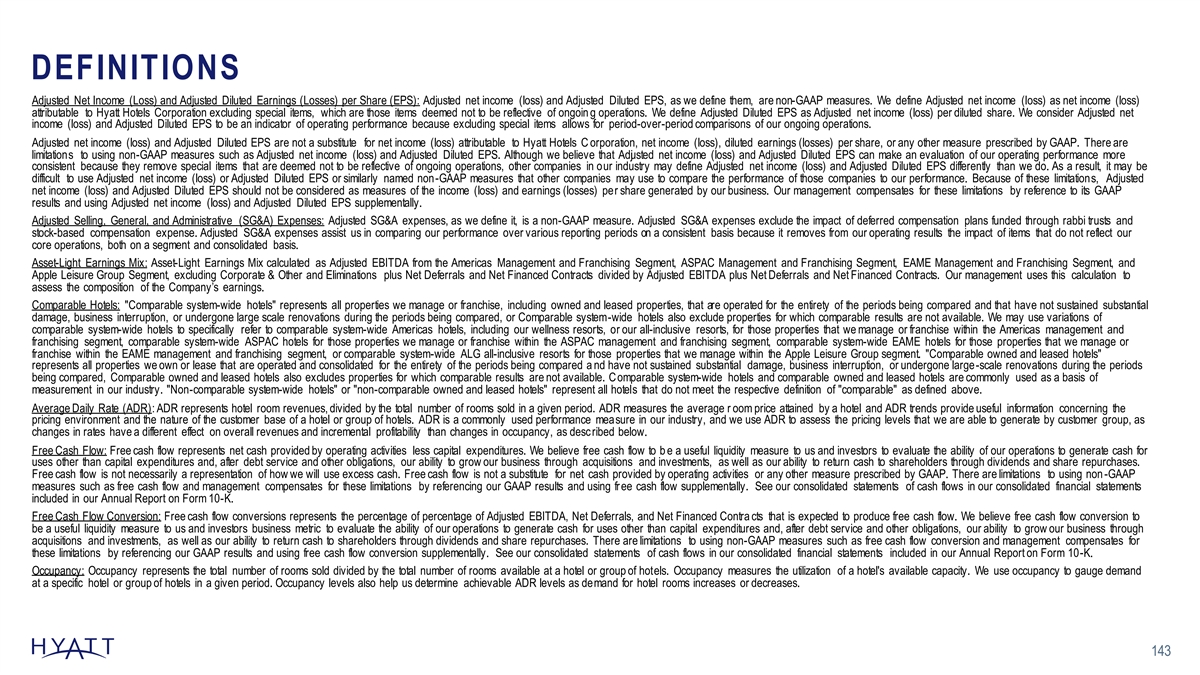 DEFINITIONS Adjusted Net Income (Loss) and Adjusted Diluted Earnings (Losses) per Share (EPS): Adjusted net income (loss) and Adjusted Diluted EPS, as we define them, are non-GAAP measures. We define Adjusted net income (loss) as net income (loss) attributable to Hyatt Hotels Corporation excluding special items, which are those items deemed not to be reflective of ongoin g operations. We define Adjusted Diluted EPS as Adjusted net income (loss) per diluted share. We consider Adjusted net income (loss) and Adjusted Diluted EPS to be an indicator of operating performance because excluding special items allows for period-over-period comparisons of our ongoing operations. Adjusted net income (loss) and Adjusted Diluted EPS are not a substitute for net income (loss) attributable to Hyatt Hotels C orporation, net income (loss), diluted earnings (losses) per share, or any other measure prescribed by GAAP. There are limitations to using non-GAAP measures such as Adjusted net income (loss) and Adjusted Diluted EPS. Although we believe that Adu j sted net income (loss) and Adjusted Diluted EPS can make an evaluation of our operating performance more consistent because they remove special items that are deemed not to be reflective of ongoing operations, other companies in our industry may define Adjusted net income (loss) and Adjusted Diluted EPS differently than we do. As a result, it may be difficult to use Adjusted net income (loss) or Adjusted Diluted EPS or similarly named non-GAAP measures that other companies may use to compare the performance of those companies to our performance. Because of these limitations, Adjusted net income (loss) and Adjusted Diluted EPS should not be considered as measures of the income (loss) and earnings (losses) per share generated by our business. Our management compensates for these limitations by reference to its GAAP results and using Adjusted net income (loss) and Adjusted Diluted EPS supplementally. Adjusted Selling, General, and Administrative (SG&A) Expenses: Adjusted SG&A expenses, as we define it, is a non-GAAP measure. Adjusted SG&A expenses exclude the impact of deferred compensation plans funded through rabbi trusts and stock-based compensation expense. Adjusted SG&A expenses assist us in comparing our performance over various reporting periods on a consistent basis because it removes from our operating results the impact of items that do not reflect our core operations, both on a segment and consolidated basis. Asset-Light Earnings Mix: Asset-Light Earnings Mix calculated as Adjusted EBITDA from the Americas Management and Franchising Segment, ASPAC Management and Franchising Segment, EAME Management and Franchising Segment, and Apple Leisure Group Segment, excluding Corporate & Other and Eliminations plus Net Deferrals and Net Financed Contracts divided by Adjusted EBITDA plus Net Deferrals and Net Financed Contracts. Our management uses this calculation to assess the composition of the Company’s earnings. Comparable Hotels: Comparable system-wide hotels represents all properties we manage or franchise, including owned and leased properties, that are operated for the entirety of the periods being compared and that have not sustained substantial damage, business interruption, or undergone large scale renovations during the periods being compared, or Comparable system-wide hotels also exclude properties for which comparable results are not available. We may use variations of comparable system-wide hotels to specifically refer to comparable system-wide Americas hotels, including our wellness resorts, or our all-inclusive resorts, for those properties that we manage or franchise within the Americas management and franchising segment, comparable system-wide ASPAC hotels for those properties we manage or franchise within the ASPAC management and franchising segment, comparable system-wide EAME hotels for those properties that we manage or franchise within the EAME management and franchising segment, or comparable system-wide ALG all-inclusive resorts for those properties that we manage within the Apple Leisure Group segment. Comparable owned and leased hotels represents all properties we own or lease that are operated and consolidated for the entirety of the periods being compared a nd have not sustained substantial damage, business interruption, or undergone large-scale renovations during the periods being compared, Comparable owned and leased hotels also excludes properties for which comparable results are not available. Comparable system-wide hotels and comparable owned and leased hotels are commonly used as a basis of measurement in our industry. Non-comparable system-wide hotels or non-comparable owned and leased hotels represent all hotels that do not meet the respective definition of comparable as defined above. Average Daily Rate (ADR): ADR represents hotel room revenues, divided by the total number of rooms sold in a given period. ADR measures the average r oom price attained by a hotel and ADR trends provide useful information concerning the pricing environment and the nature of the customer base of a hotel or group of hotels. ADR is a commonly used performance measure in our industry, and we use ADR to assess the pricing levels that we are able to generate by customer group, as changes in rates have a different effect on overall revenues and incremental profitability than changes in occupancy, as described below. Free Cash Flow: Free cash flow represents net cash provided by operating activities less capital expenditures. We believe free cash flow to b e a useful liquidity measure to us and investors to evaluate the ability of our operations to generate cash for uses other than capital expenditures and, after debt service and other obligations, our ability to grow our business through acquisitions and investments, as well as our ability to return cash to shareholders through dividends and share repurchases. Free cash flow is not necessarily 