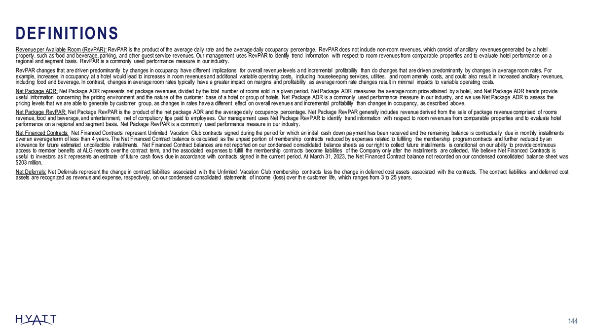 DEFINITIONS Revenue per Available Room (RevPAR): RevPAR is the product of the average daily rate and the average daily occupancy percentage. RevPAR does not include non-room revenues, which consist of ancillary revenues generated by a hotel property, such as food and beverage, parking, and other guest service revenues. Our management uses RevPAR to identify trend information with respect to room revenues from comparable properties and to evaluate hotel performance on a regional and segment basis. RevPAR is a commonly used performance measure in our industry. RevPAR changes that are driven predominantly by changes in occupancy have different implications for overall revenue levels a nd incremental profitability than do changes that are driven predominantly by changes in average room rates. For example, increases in occupancy at a hotel would lead to increases in room revenues and additional variable operating costs, including housekeeping services, utilities, and room amenity costs, and could also result in increased ancillary revenues, including food and beverage. In contrast, changes in average room rates typically have a greater impact on margins and profitability as average room rate changes result in minimal impacts to variable operating costs. Net Package ADR: Net Package ADR represents net package revenues, divided by the total number of rooms sold in a given period. Net Package ADR measures the average room price attained by a hotel, and Net Package ADR trends provide useful information concerning the pricing environment and the nature of the customer base of a hotel or group of hotels. Net Package ADR is a commonly used performance measure in our industry, and we use Net Package ADR to assess the pricing levels that we are able to generate by customer group, as changes in rates have a different effect on overall revenue s and incremental profitability than changes in occupancy, as described above. Net Package RevPAR: Net Package RevPAR is the product of the net package ADR and the average daily occupancy percentage. Net Package RevPAR generally includes revenue derived from the sale of package revenue comprised of rooms revenue, food and beverage, and entertainment, net of compulsory tips paid to employees. Our management uses Net Package RevPAR to identify trend information with respect to room revenues from comparable properties and to evaluate hotel performance on a regional and segment basis. Net Package RevPAR is a commonly used performance measure in our industry. Net Financed Contracts: Net Financed Contracts represent Unlimited Vacation Club contracts signed during the period for which an initial cash down pa yment has been received and the remaining balance is contractually due in monthly installments over an average term of less than 4 years. The Net Financed Contract balance is calculated as the unpaid portion of membership contracts reduced by expenses related to fulfilling the membership program contracts and further reduced by an allowance for future estimated uncollectible installments. Net Financed Contract balances are not reported on our condensed consolidated balance sheets as our right to collect future installments is conditional on our ability to provide continuous access to member benefits at ALG resorts over the contract term, and the associated expenses to fulfill the membership contracts become liabilities of the Company only after the installments are collected. We believe Net Financed Contracts is useful to investors as it represents an estimate of future cash flows due in accordance with contracts signed in the current period. At March 31, 2023, the Net Financed Contract balance not recorded on our condensed consolidated balance sheet was $203 million. Net Deferrals: Net Deferrals represent the change in contract liabilities associated with the Unlimited Vacation Club membership contracts less the change in deferred cost assets associated with the contracts. The contract liabilities and deferred cost assets are recognized as revenue and expense, respectively, on our condensed consolidated statements of income (loss) over th e customer life, which ranges from 3 to 25 years. 144